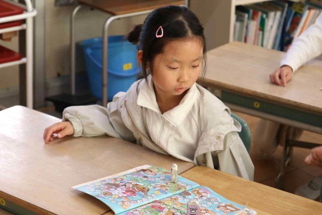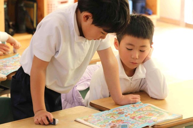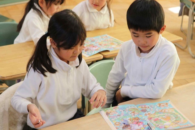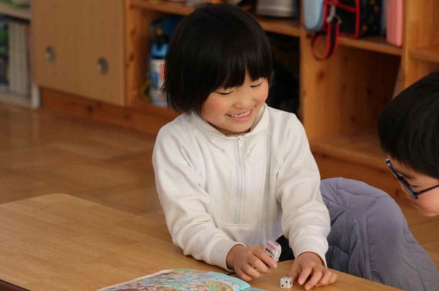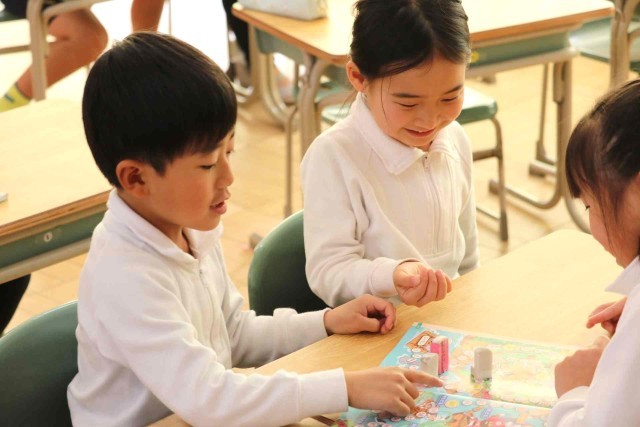 算数の授業で大きな数の学習をしました。100までの数を覚えたので、すごろくをしてみました。止まるマスの数字を覚えながら、友達と仲良く学んでいました。