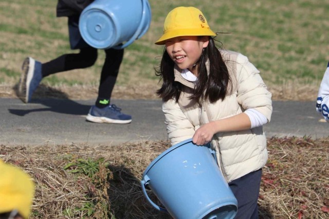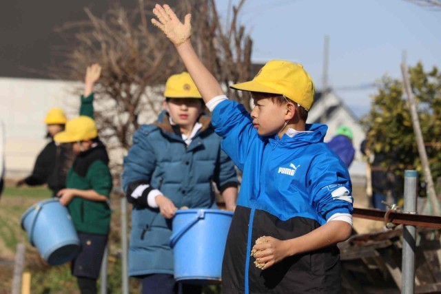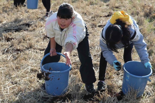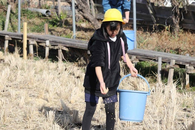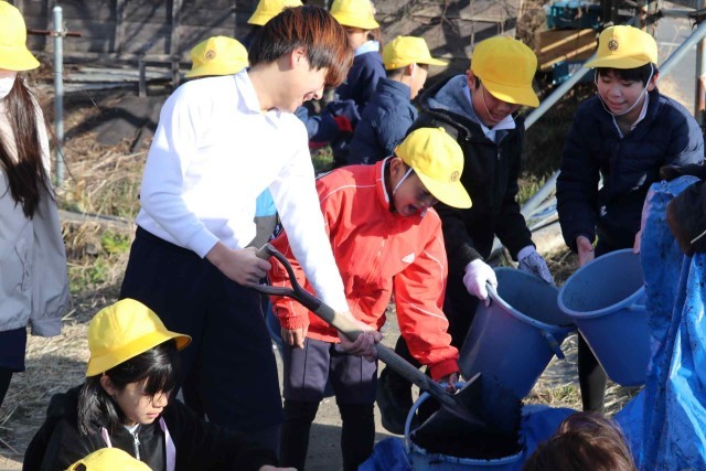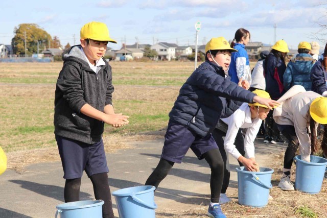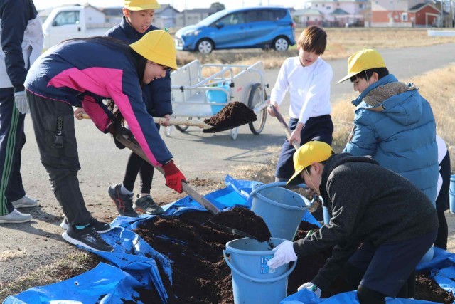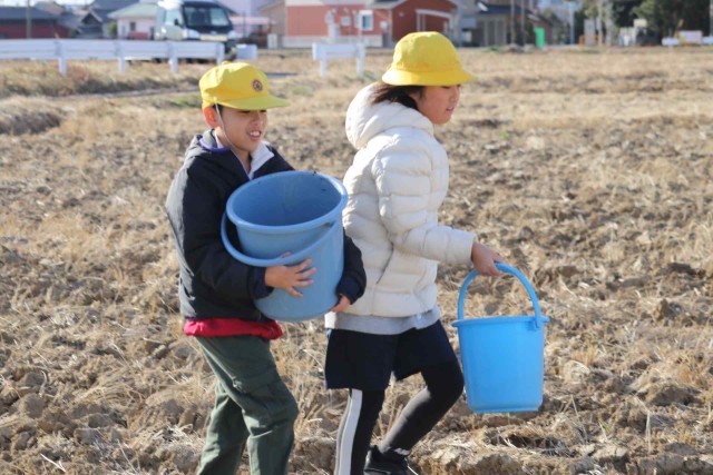 5年生が田んぼに肥料を与えました。たい肥と米ぬかをまんべんなく田んぼにまくことができました。たっぷりの栄養をもらって、来年のお米もたくさん取れるのではないかと思います。