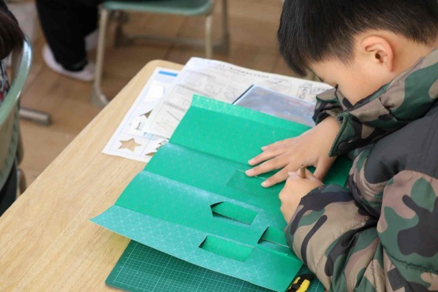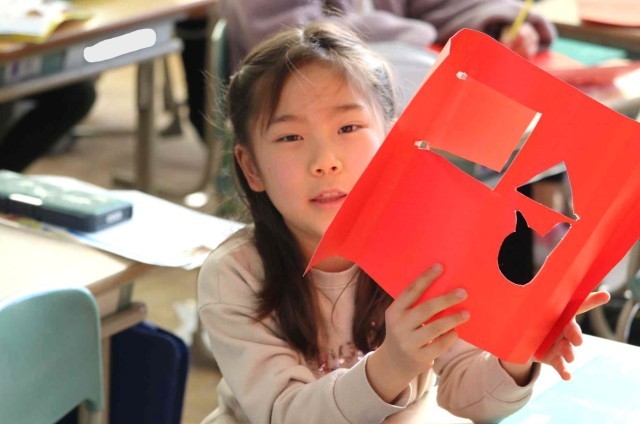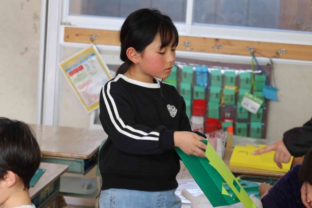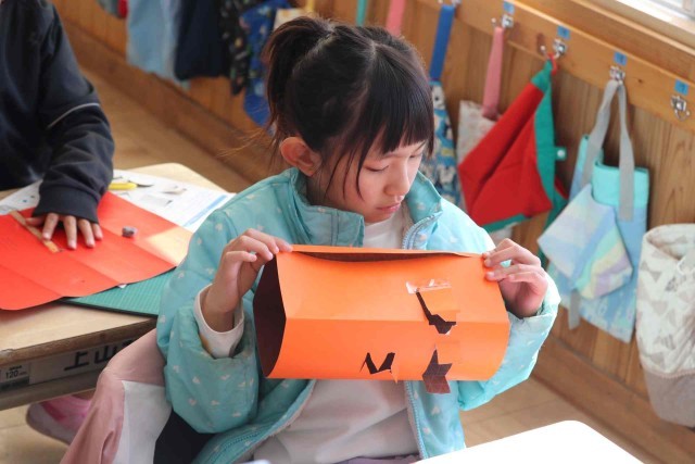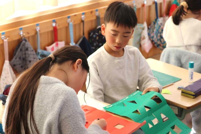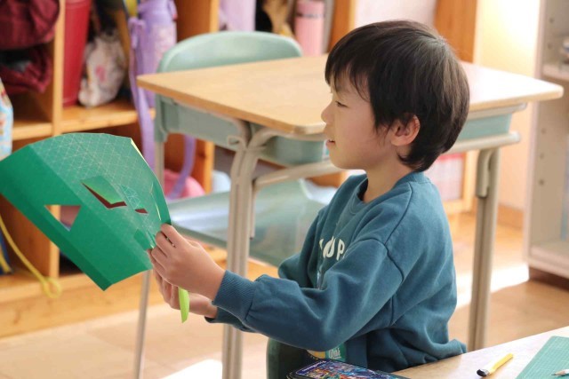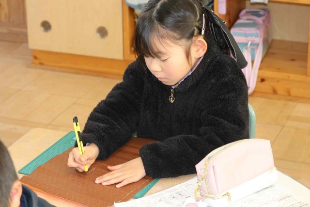 図工の授業で色画用紙を使った工作をしました。カッターナイフで窓の部分をくり抜いて、自由に建物を作りました。丸、三角、四角など、自分のイメージ通りに穴を開けていました。