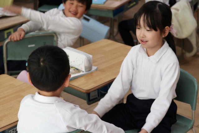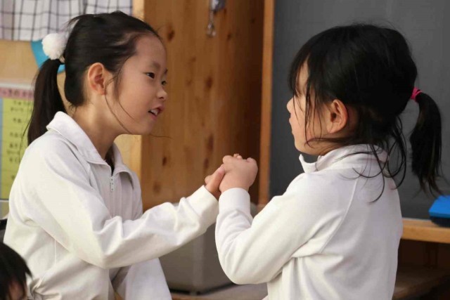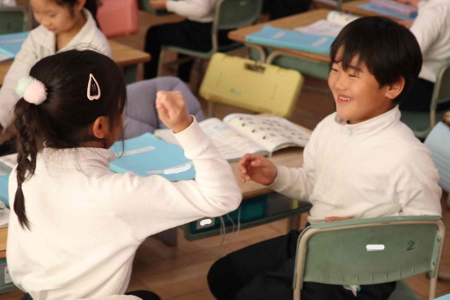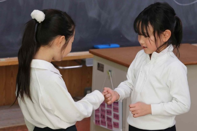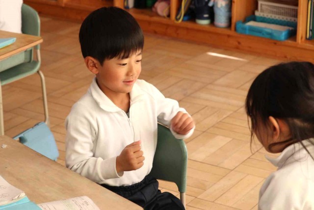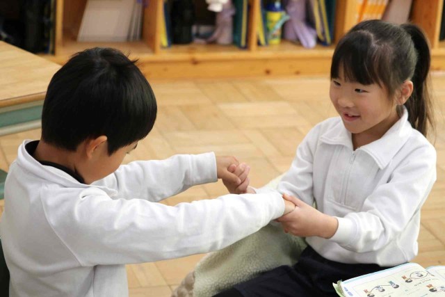 音楽の授業でわらべ唄の学習をしました。「せっせっせーのよいよいよい」で始まる「おちゃらか ほい」を楽しそうに歌っていました。わらべ唄のリズムの面白さに気がついたようでした。