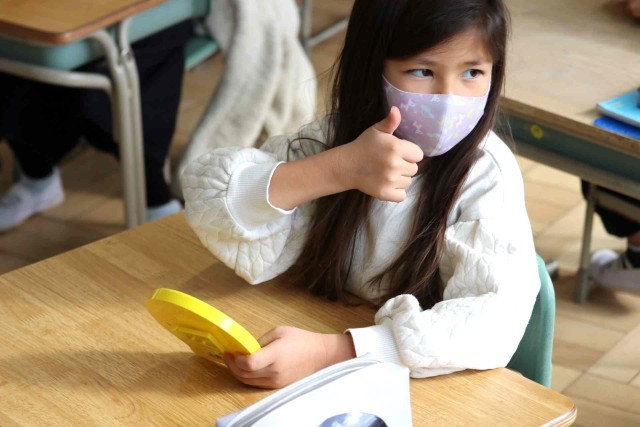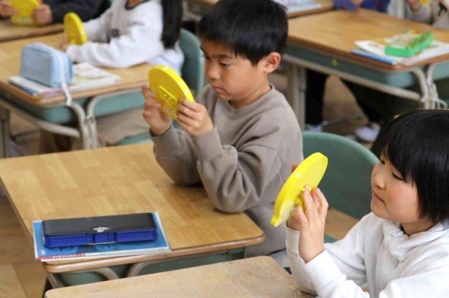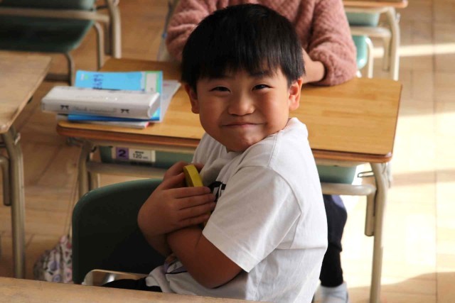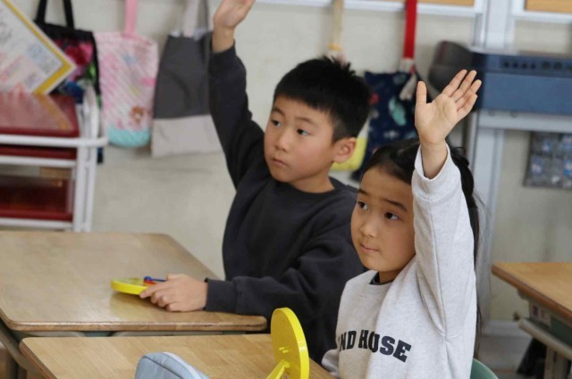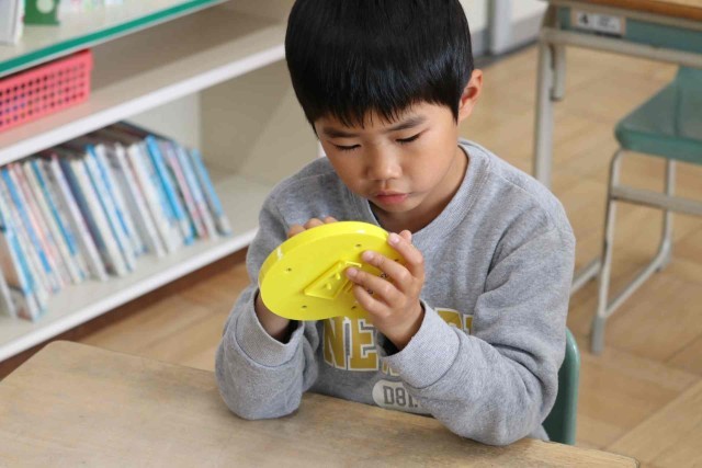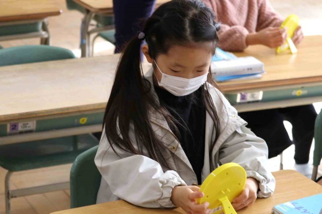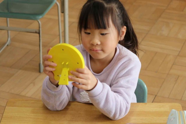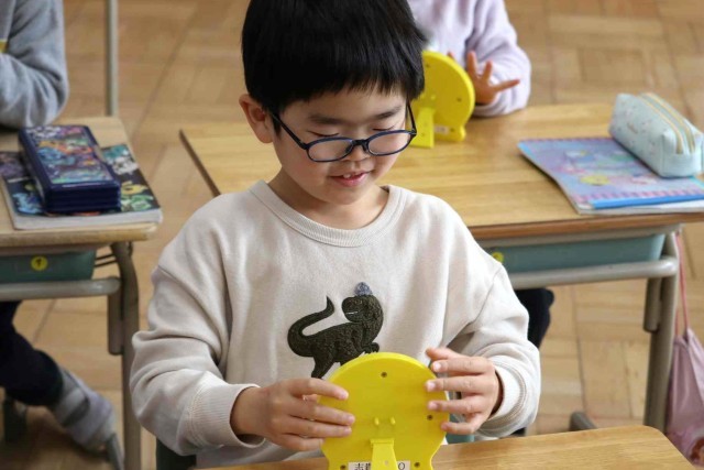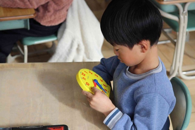 算数の授業で時計の読み方を学習しました。先生が「3時24分」「8時35分」「11時51分」など時間を決めると、おもちゃの時計を動かして正しい位置に針を示すことができました。