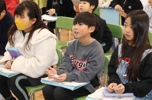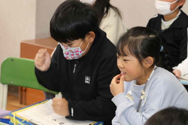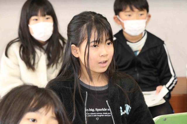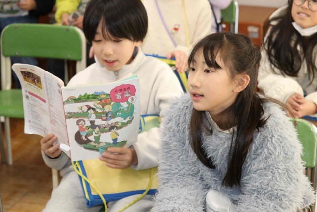 音楽の授業で郷土の伝統音楽を鑑賞しました。大太鼓、締太鼓、篠笛、鉦で編成される「神田囃子(かんだばやし)」のリズムを取るために、手をたたいたり、口で「テンテンツクツク」と歌ったりしました。