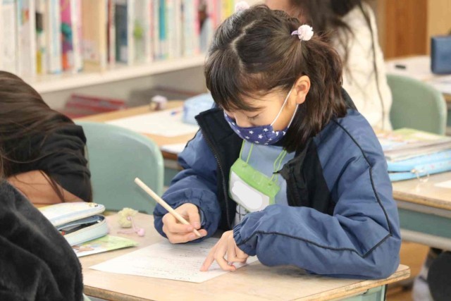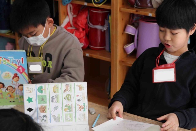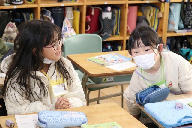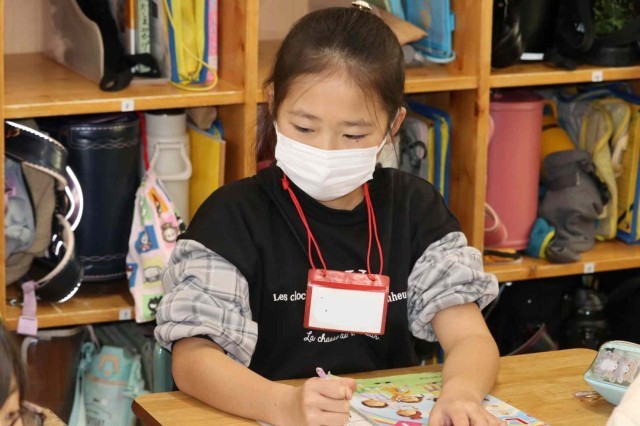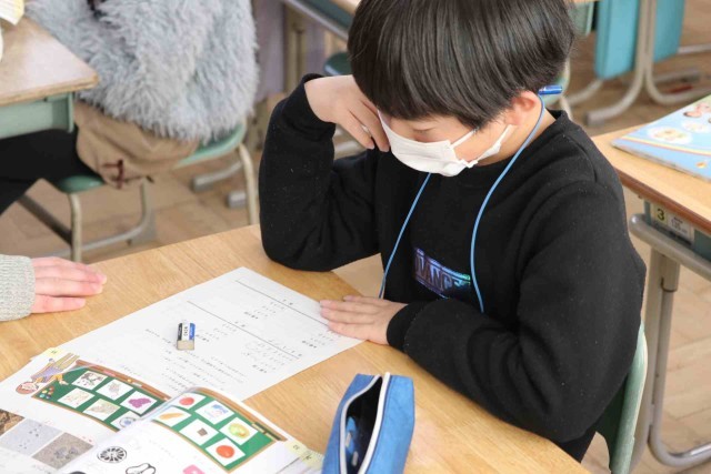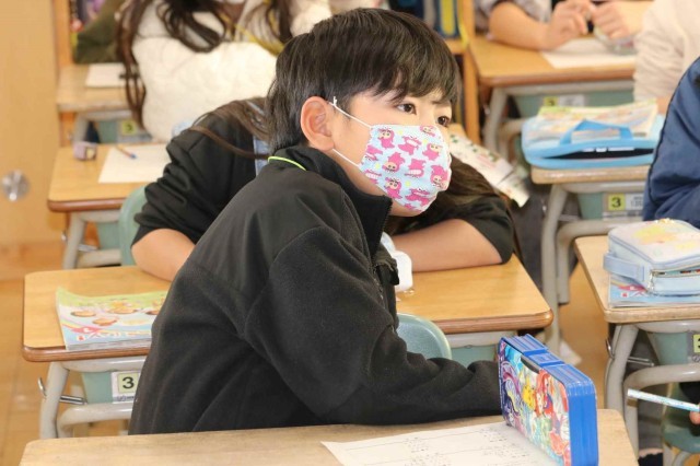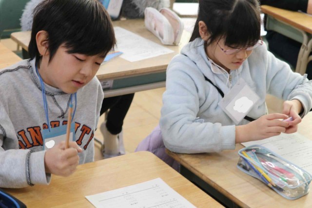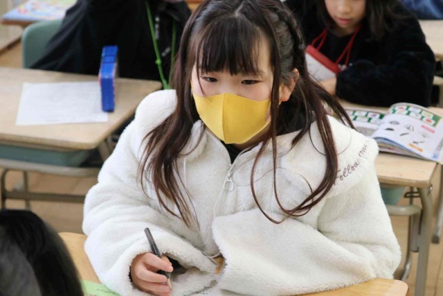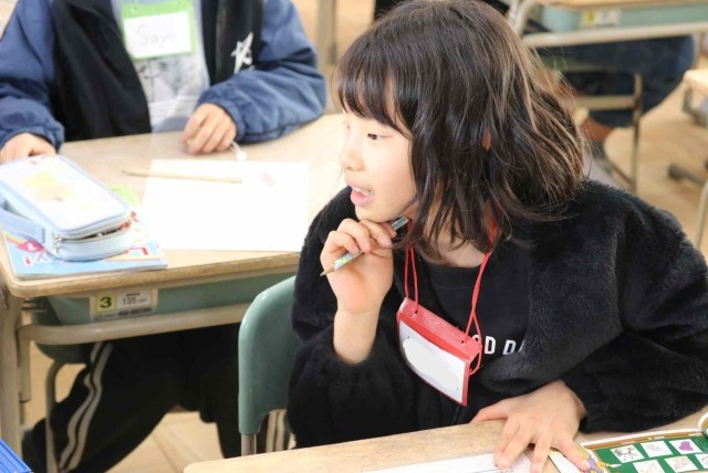 外国語活動でスリーヒントクイズの学習をしました。色や大きさ、種類など3つのヒントを出して当ててもらう活動です。好きな食べ物や動物が答えになるよう、ヒントをじっくりと考えていました。