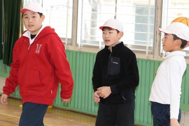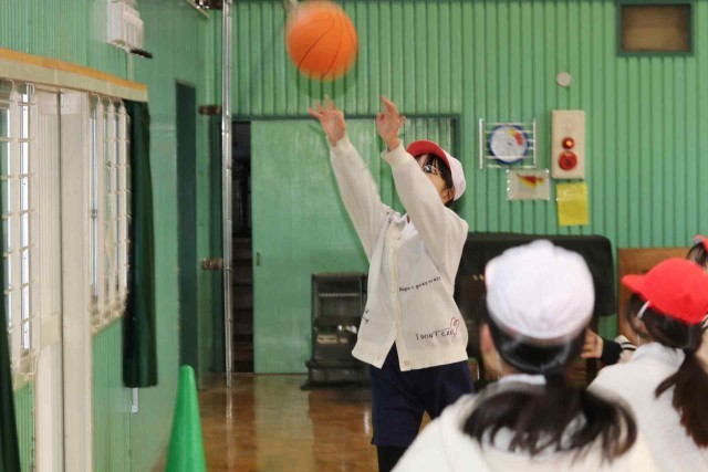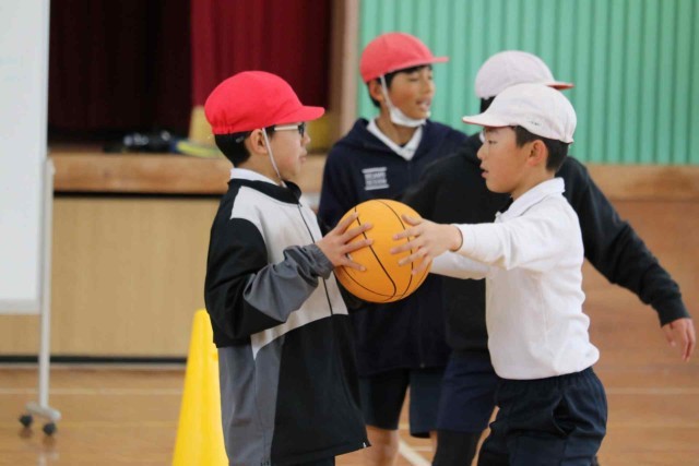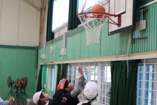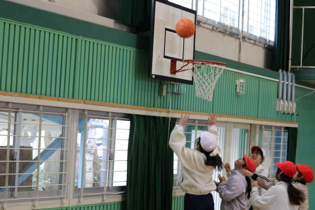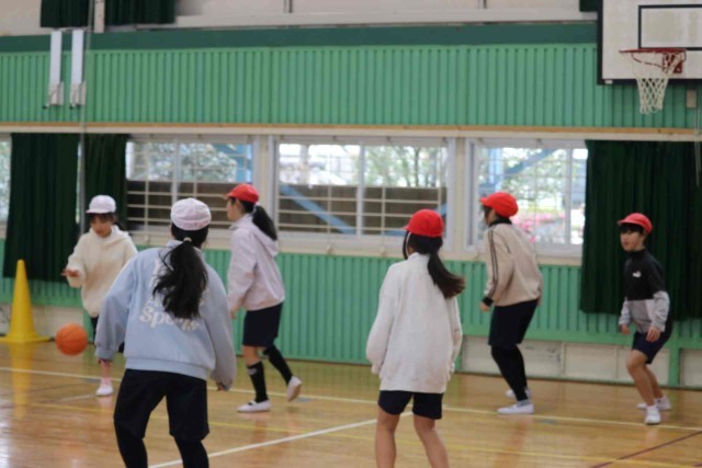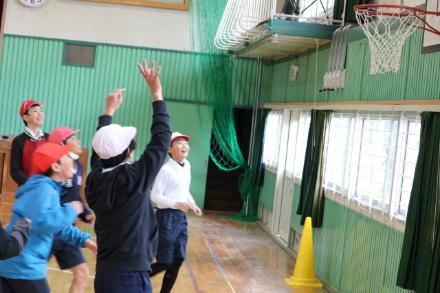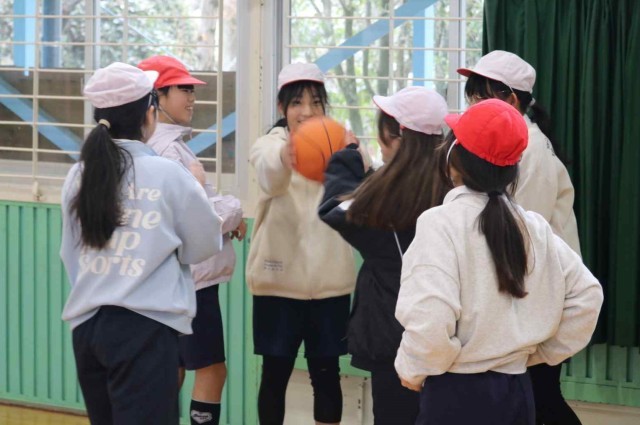 体育の授業でバスケットボールをしました。男女に分かれて4対4のゲームを楽しみました。シュートが決まる度に大きなリアクションで喜んでいました。