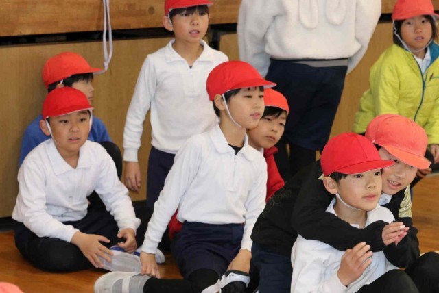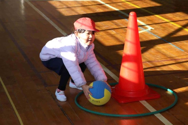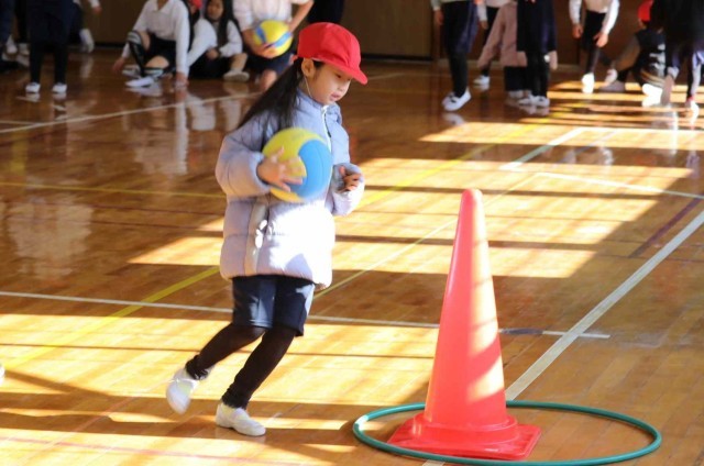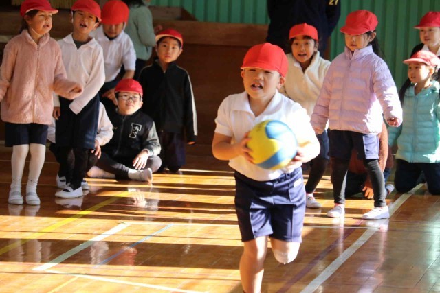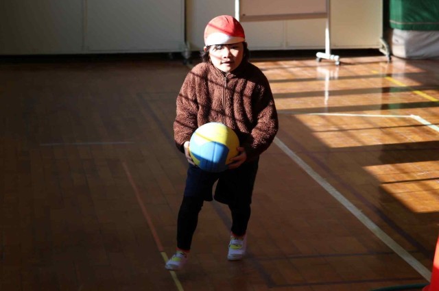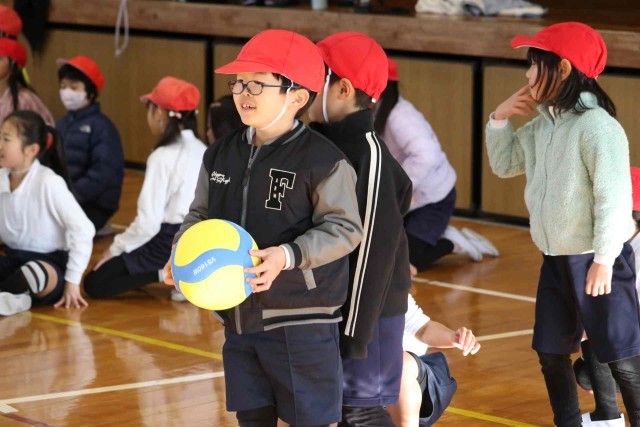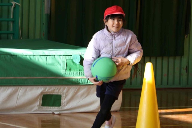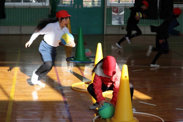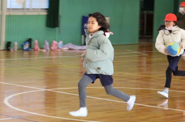 1年生と3年生が合同で体育の授業を行いました。体育館の中で学年対抗リレーをして楽しみました。どちらも負けないよう全力で走っていました。