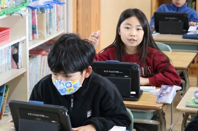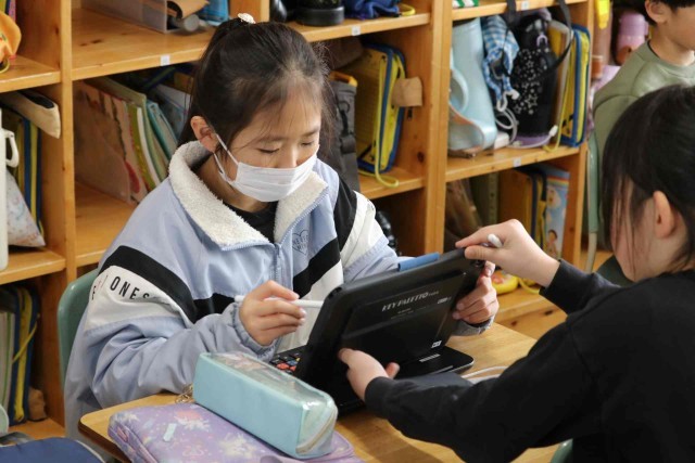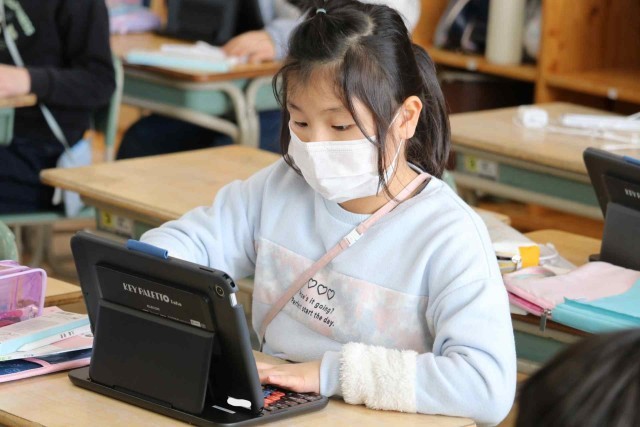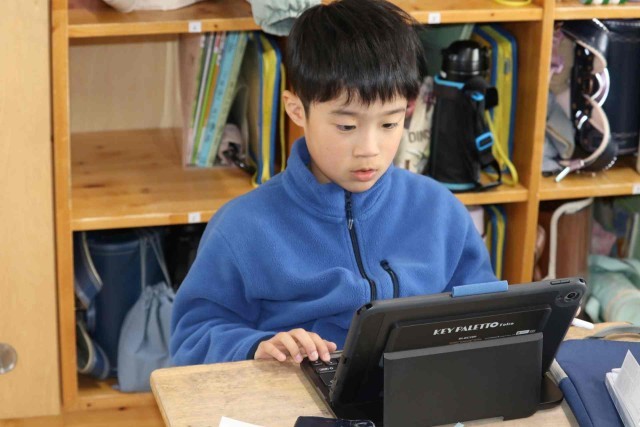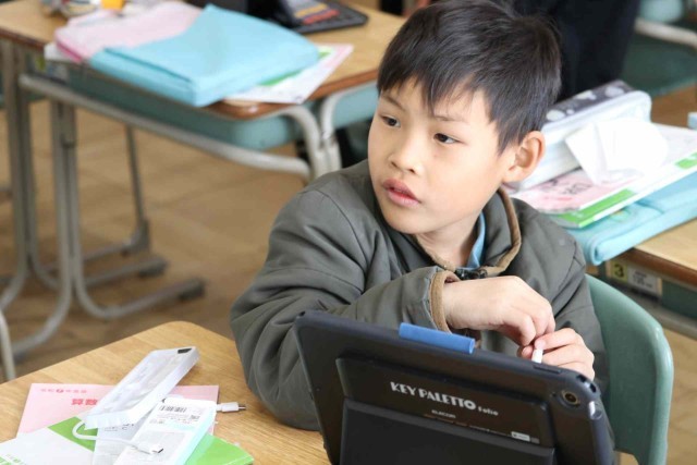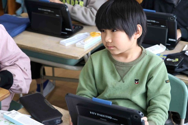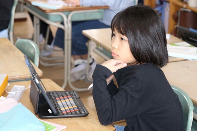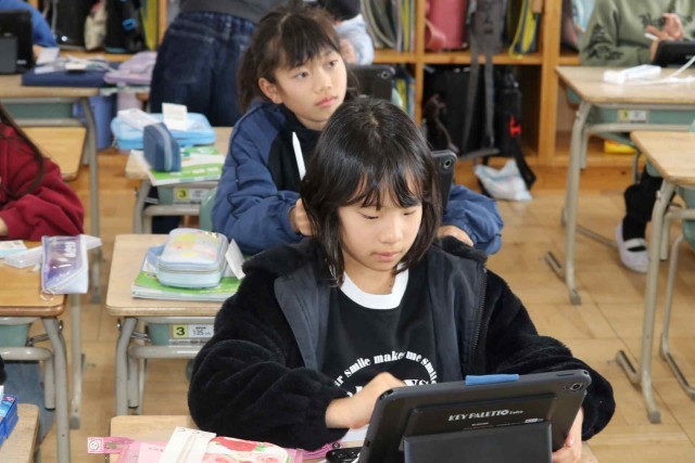 3年生にも新しいタブレットが配付されました。古いタブレットと少し操作方法が異なるようで、「こうすればできるよ」と教え合う姿が見られました。