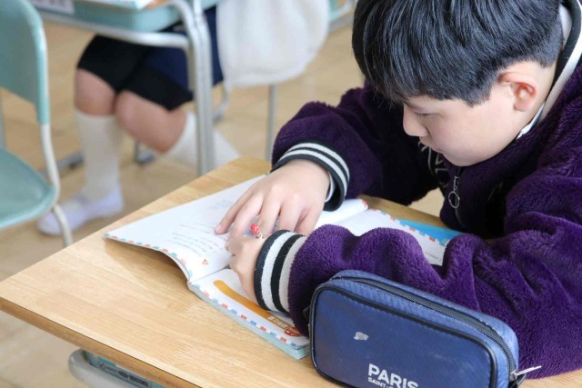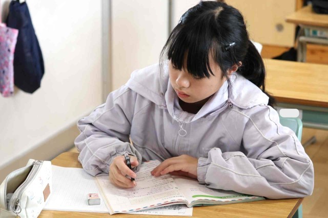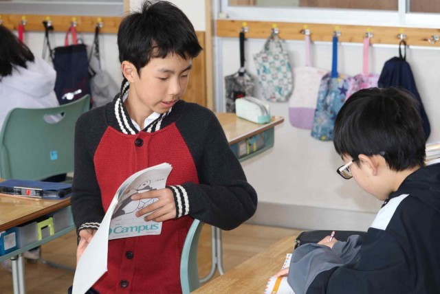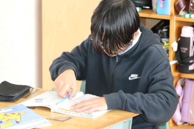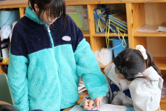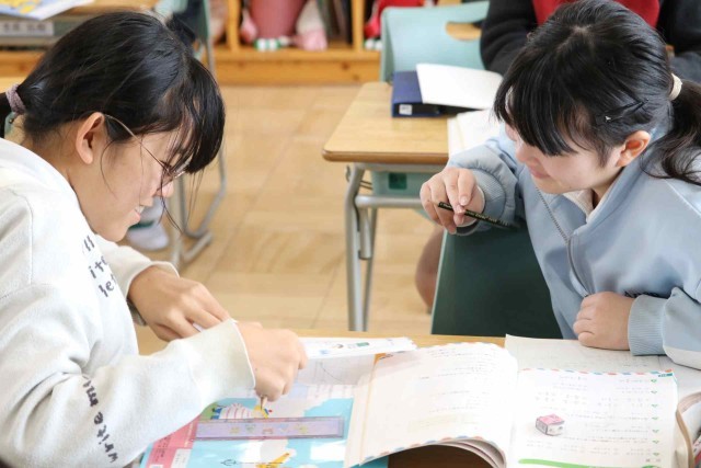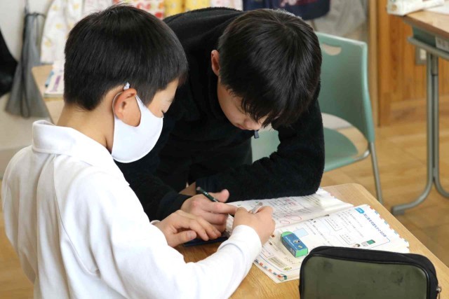 算数の授業で復習問題を解きました。小数、分数、図形などいろいろな問題に対して、解き方を思い出せず、友達に尋ねる姿がありました。分からないことに向き合う姿が立派です。