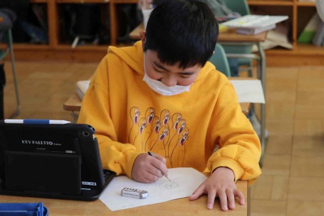 図工の授業で版画の制作をしました。まだ下書きをしている子もいれば、刷りの段階に入っている子もいました。自分の大切なものに対して愛情をもって表現しようとしていました。