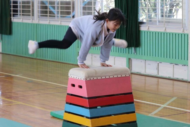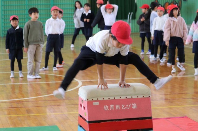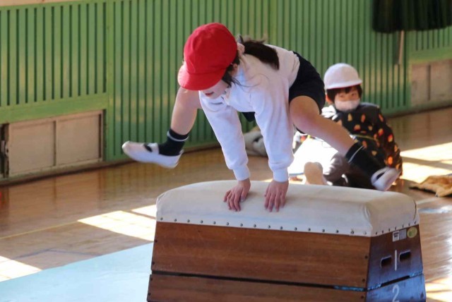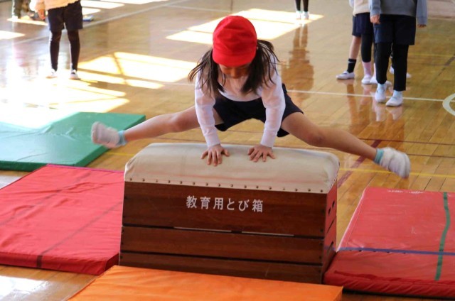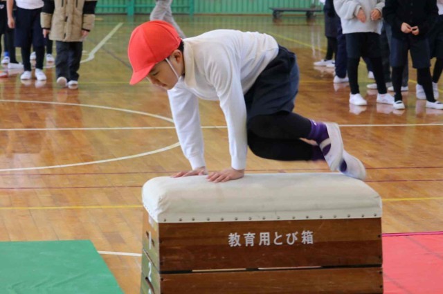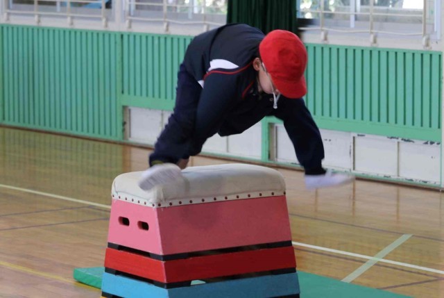 体育の授業で跳び箱の学習をしました。自身の目標を達成できるように、4種類の高さの跳び箱を自分で選びました。自信がある子は7段の高さに挑戦しました。見事に跳んだ子がたくさんいました。