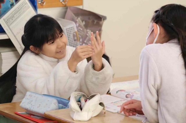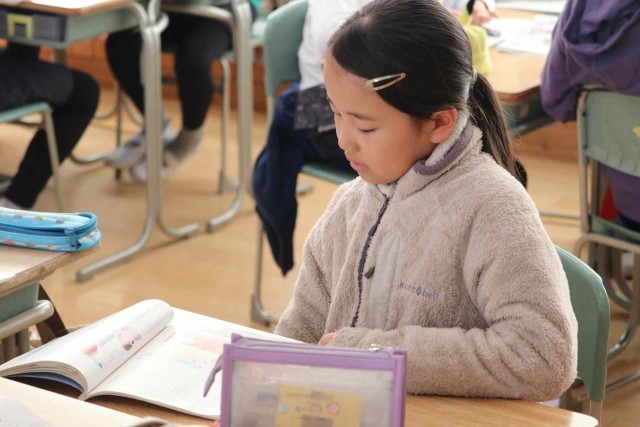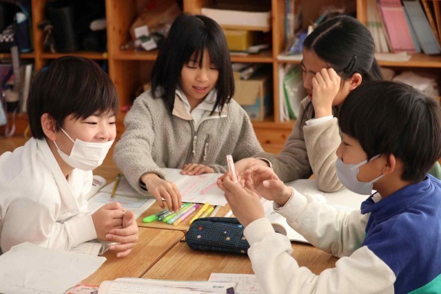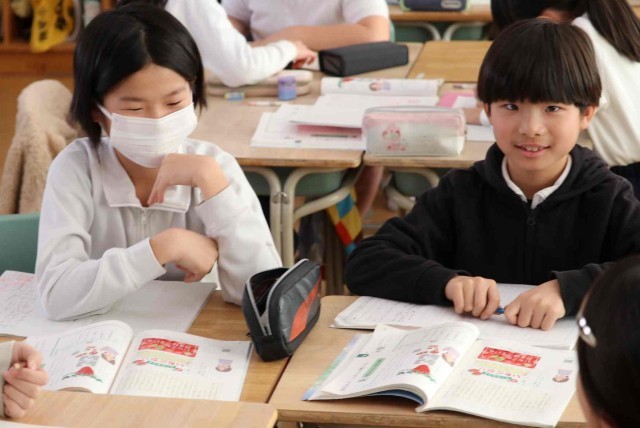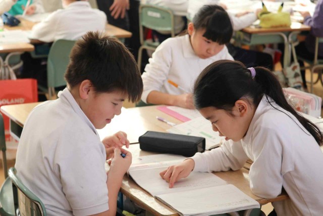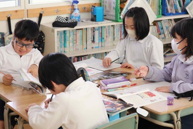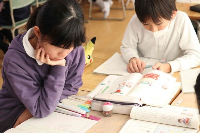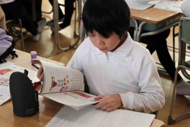 国語の授業で2種類のチラシを比べて、自分ならどちらを選ぶか説明する学習をしました。いちご祭りをテーマにしたチラシを見て、デザインや内容、配色などについて根拠となる理由を考えました。