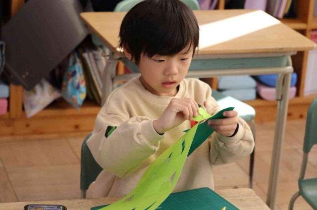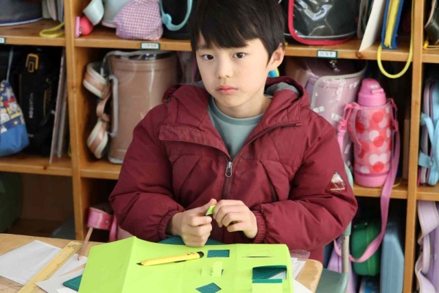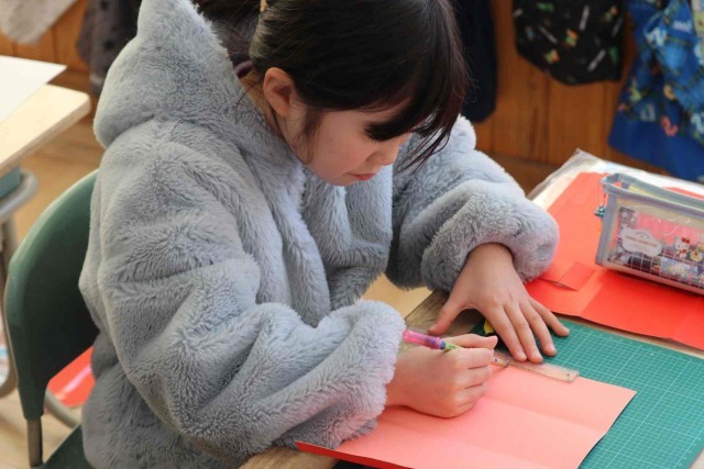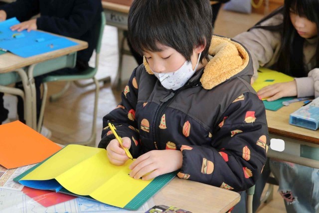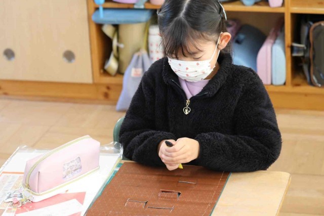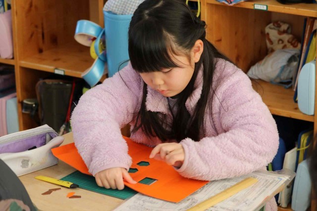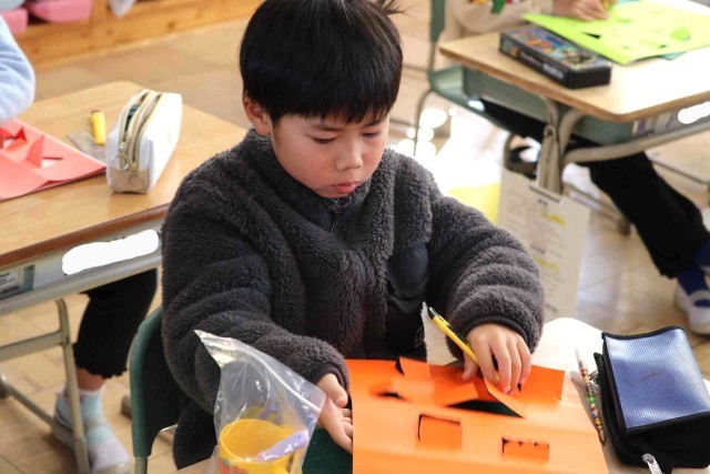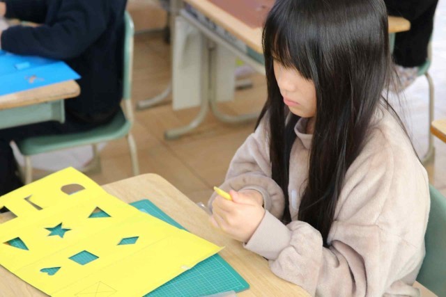 図工の授業で画用紙を使った工作をしました。カッターナイフで窓の部分をくり抜いて、自分だけの建物を作りました。窓の形も四角形だけでなく、丸や三角、星型など工夫をこらしていました。