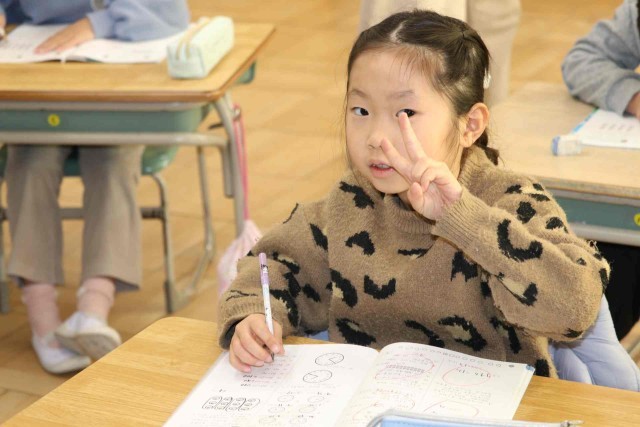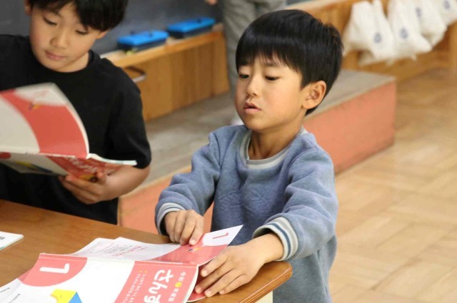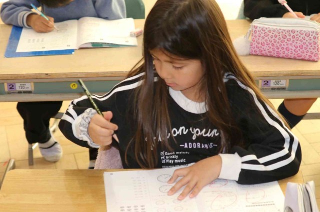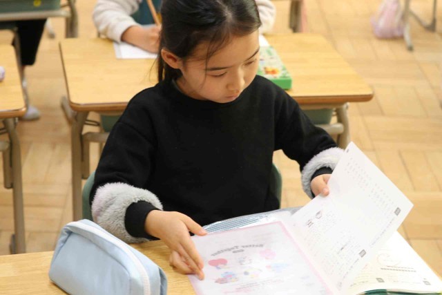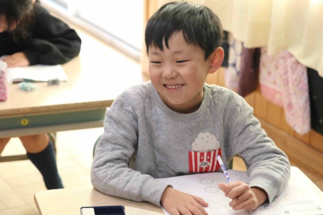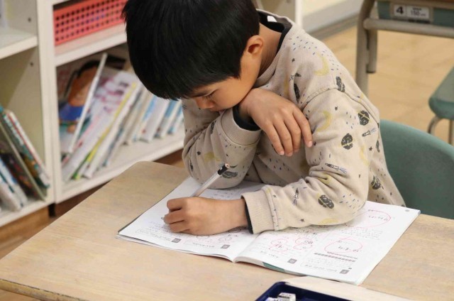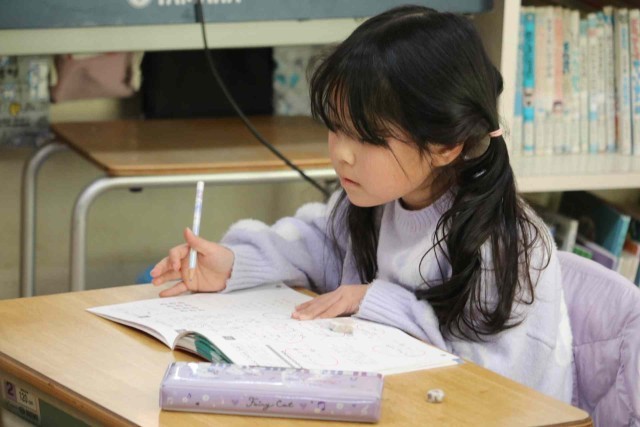 算数の授業で復習問題を解きました。時刻の読み方や足し算、引き算について、問題集を進めていました。