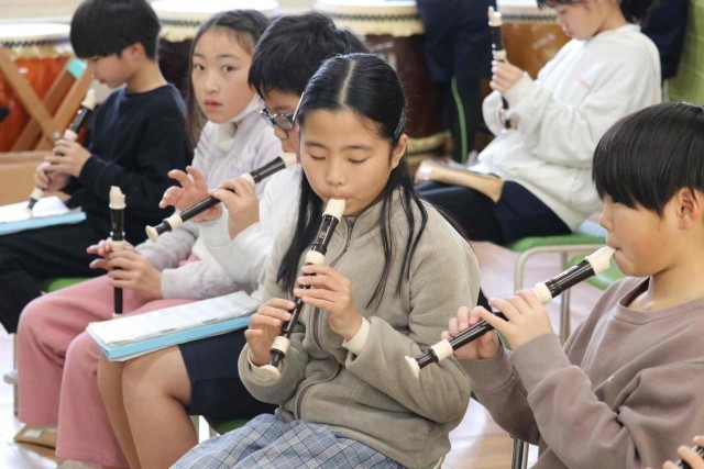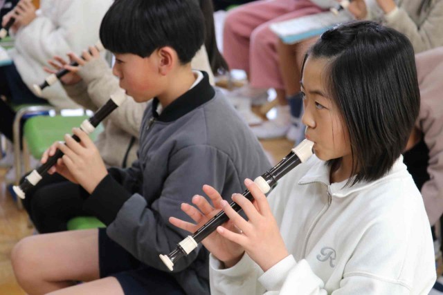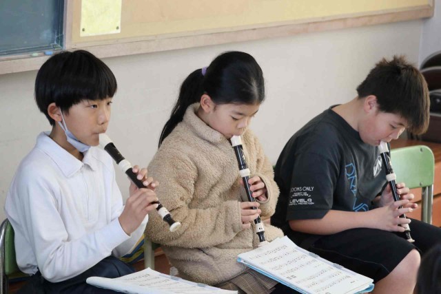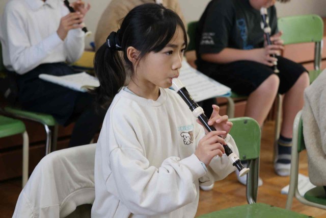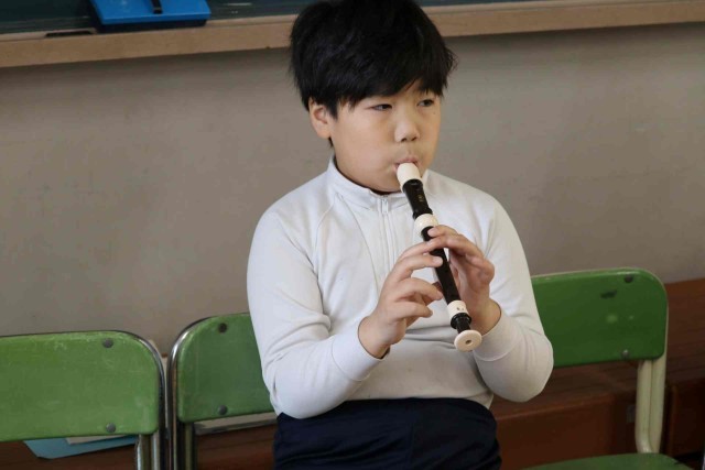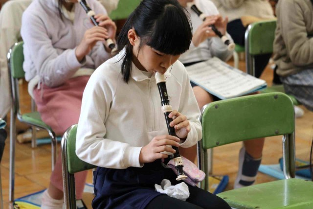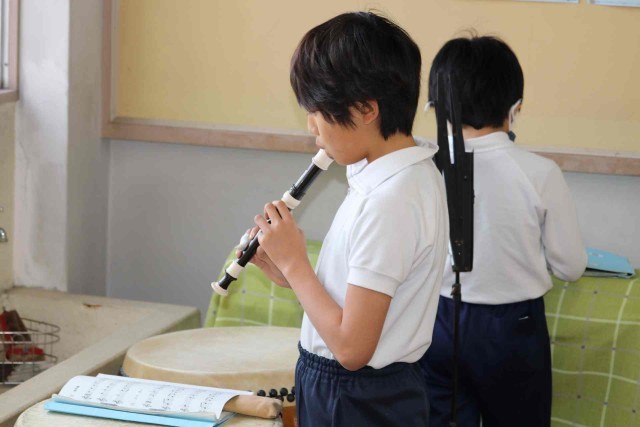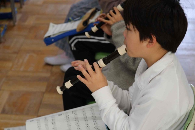 音楽の授業でリコーダーの学習をしました。「ハイ・ホー」という曲を吹けるように練習していました。全体で指使いを確認した後、個人練習を始めていました。