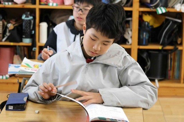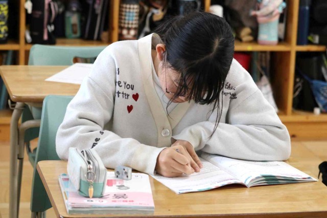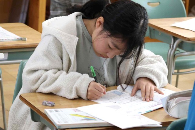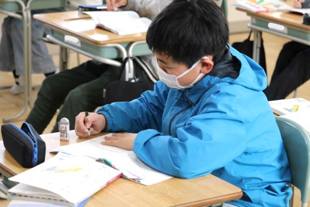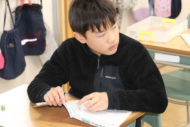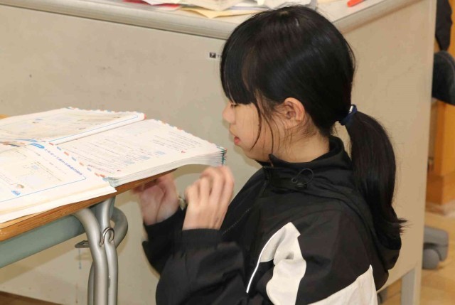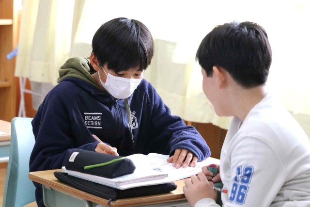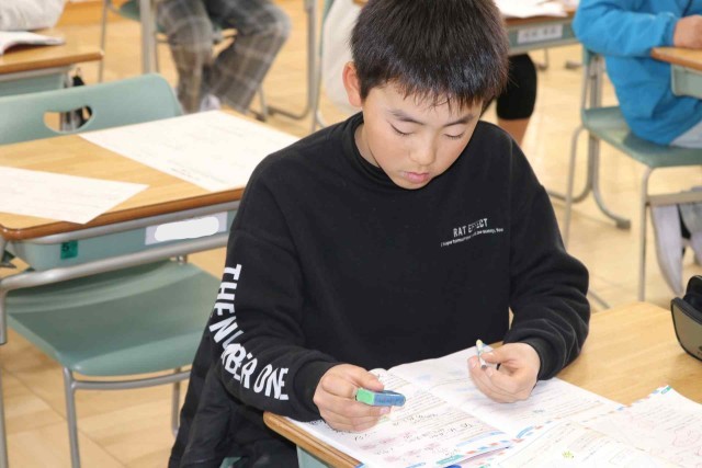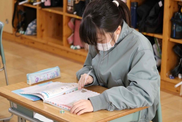 算数の授業でまとめの問題を解きました。それぞれの学習進度に合わせて、速く進む子やじっくり考える子がいました。正解した問題には担任の先生に丸をつけてもらいました。