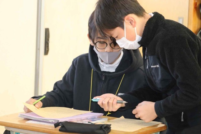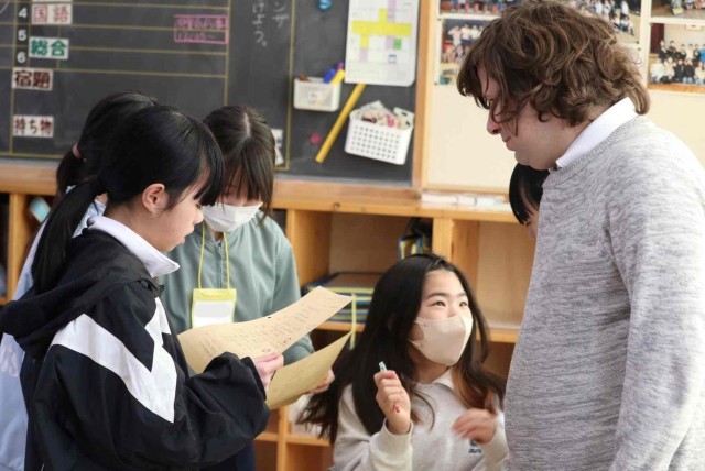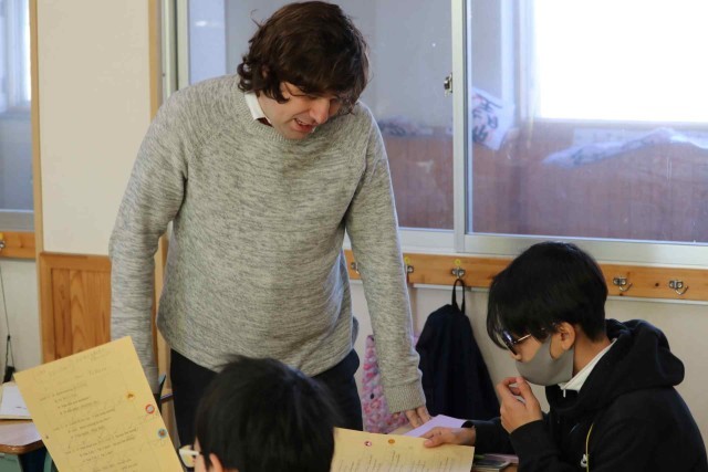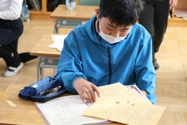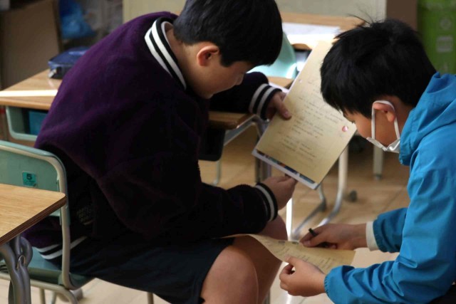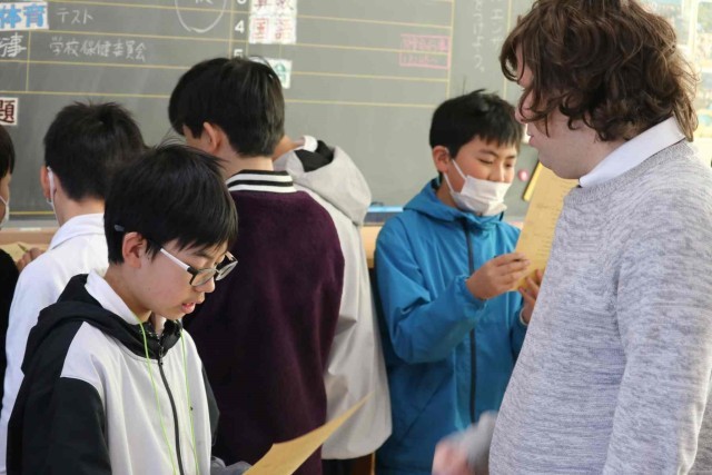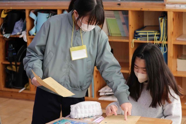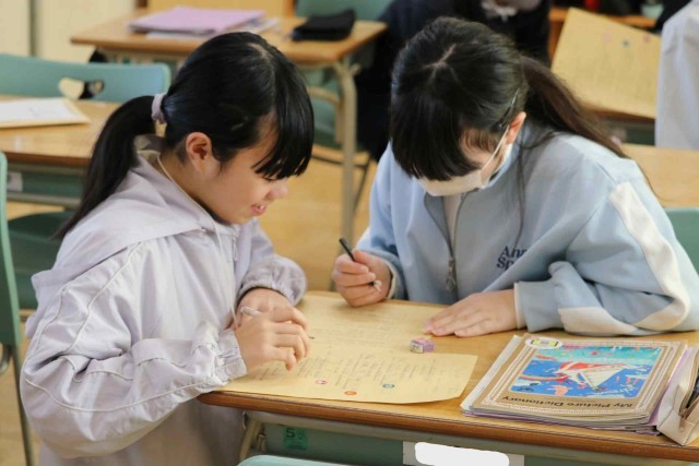 外国語の授業で英語のお話を読む学習をしました。「ヘビはかわいくない。(Snakes are not cute.)」という友達に対して、「Really? Snakes are cute.(そうかなあ、ヘビはかわいいよ)」と答えるセリフを練習していました。