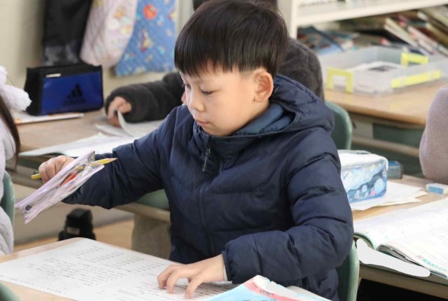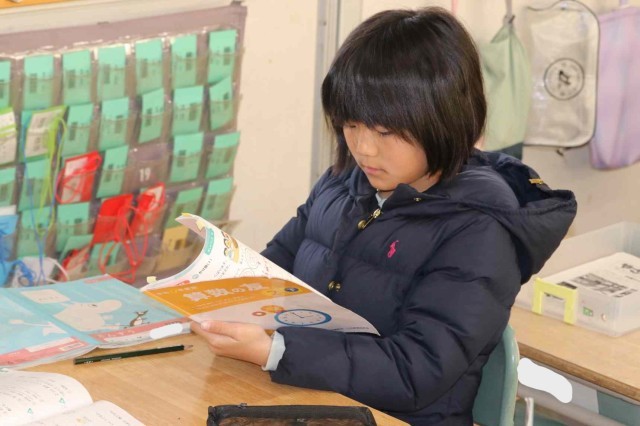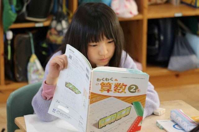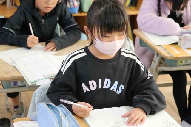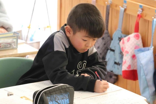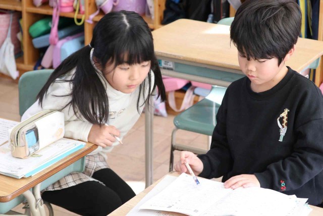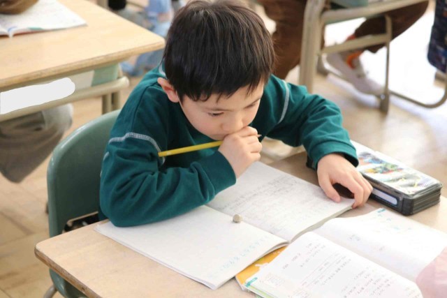 算数の授業で練習問題を解きました。まとめのテストに出題される大きな数、図形、長さ、九九などの模擬テストで、どれだけ点が取れるか確認しました。早く解けた子は新しいプリントをもらって解き直しました。