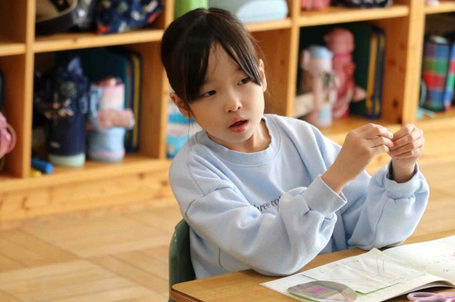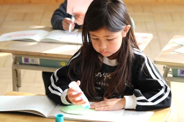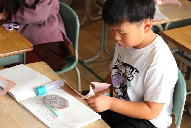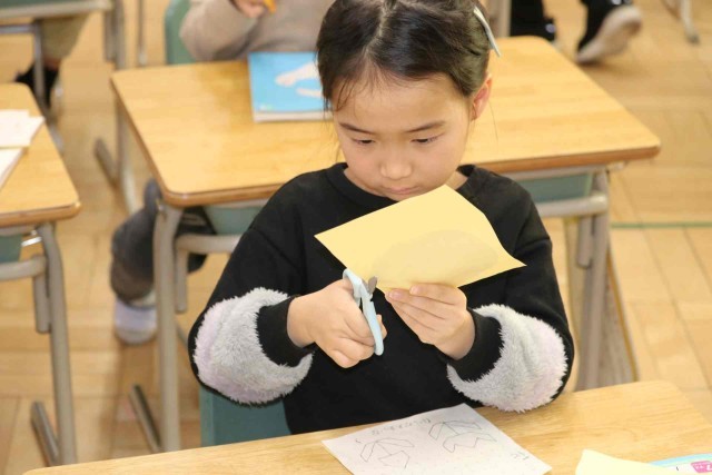 算数の授業で図形の学習をしました。三角や四角などを組み合わせた形をはさみで切り取ってノートに貼っていました。1年生で学ぶ算数の単元もほぼ終わりになりますが、「もっと算数の勉強をしたい。」という声が上がっていました。