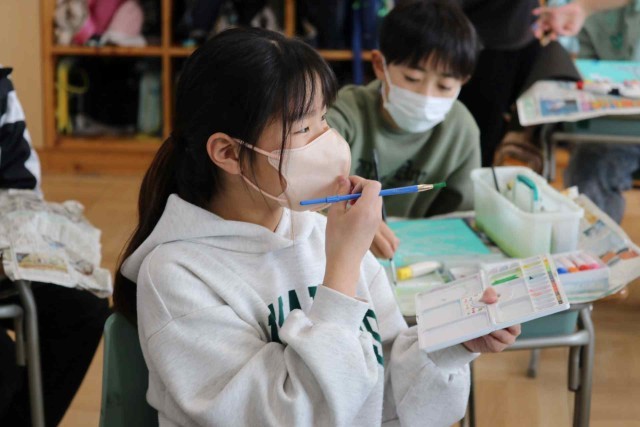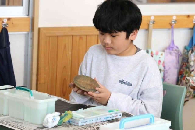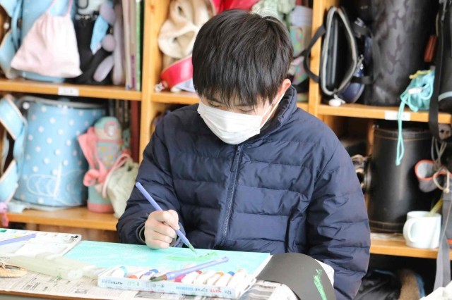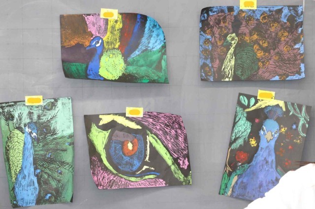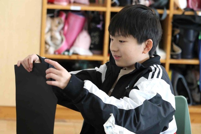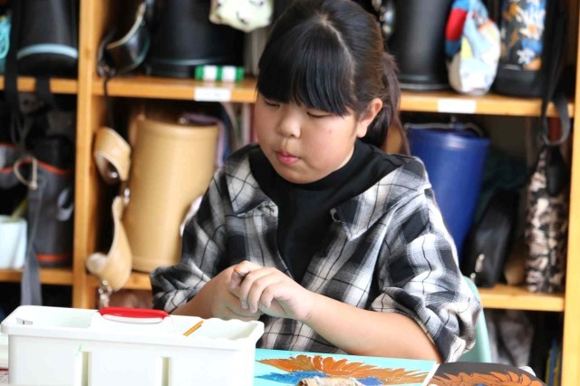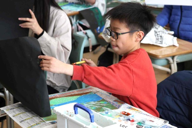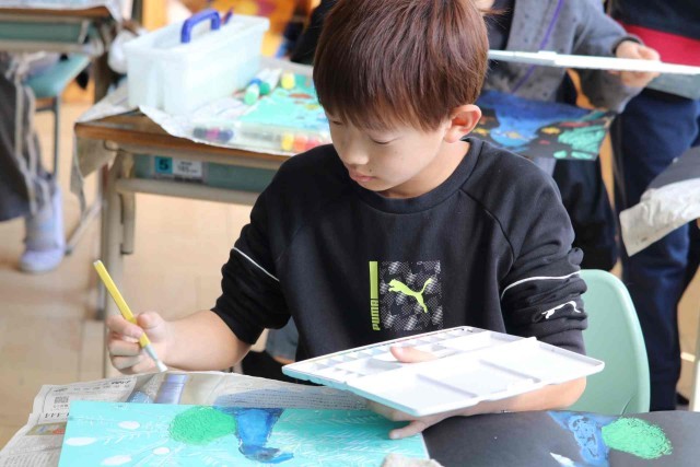 図工の授業で版画の制作をしました。原版を彫り終わり、いよいよ刷りの段階に入りました。絵の具の華やかな色合いが黒い台紙に浮かび上がり、とてもきれいな作品が完成しました。