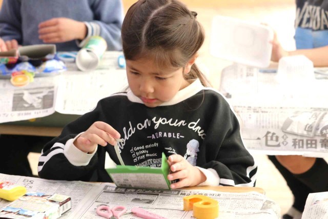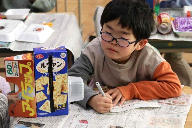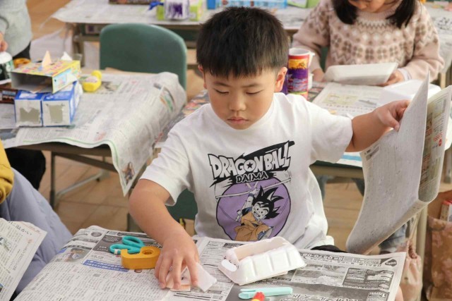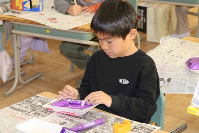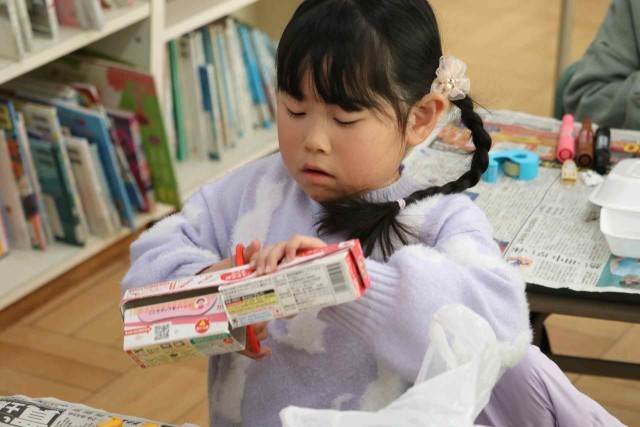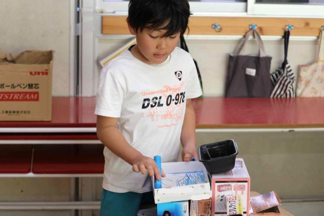 図工の授業で空き箱を使った工作をしました。お菓子や日用品の空き箱を組み合わせて、いろいろな形を作りました。シンプルに3つほどの箱を使った子もいれば、10個以上の箱を組み合わせた子もいました。