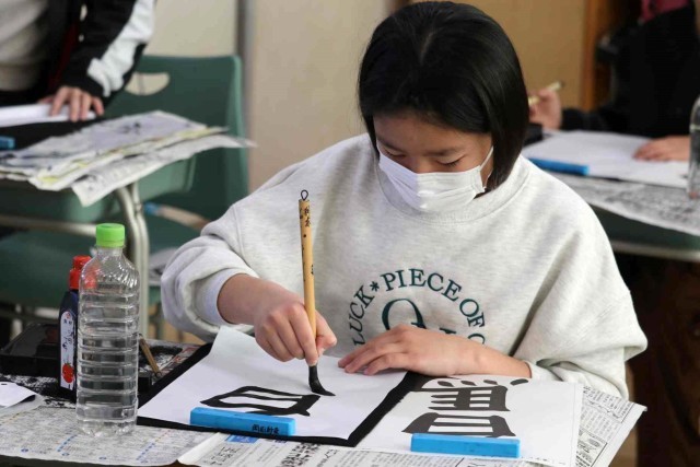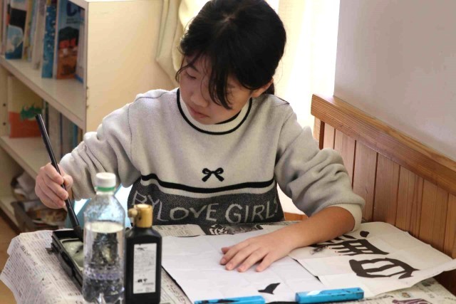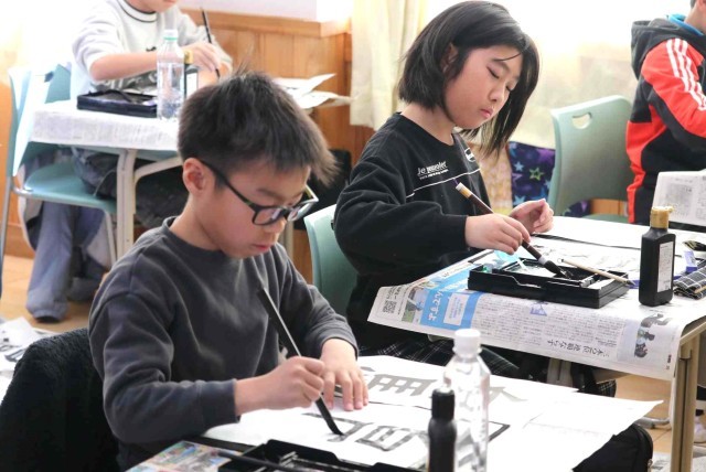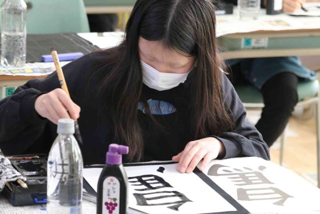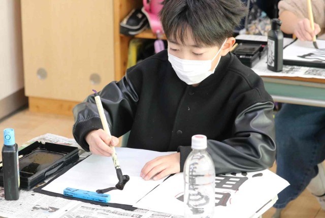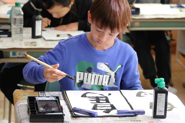 書写の授業で毛筆の学習をしました。今日は「白馬」という字を書きました。画数が多い「馬」の方が大きくなるように、字のバランスを考えて筆を滑らせていました。
