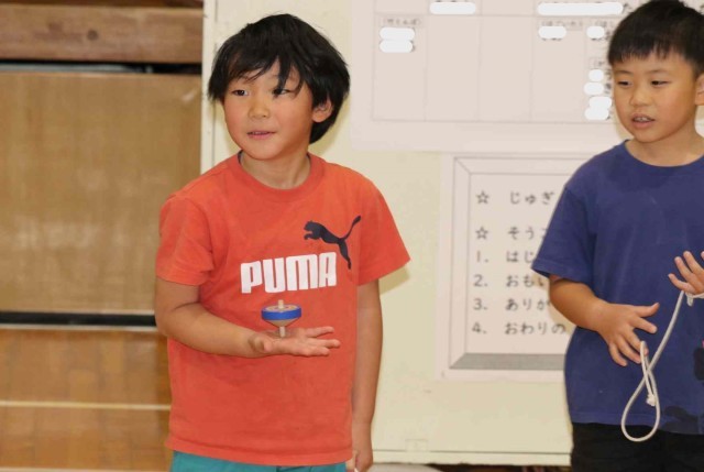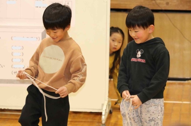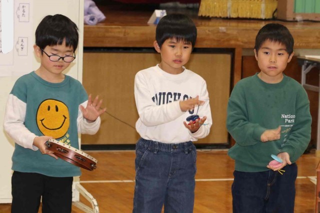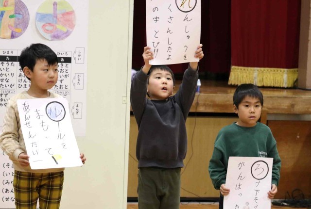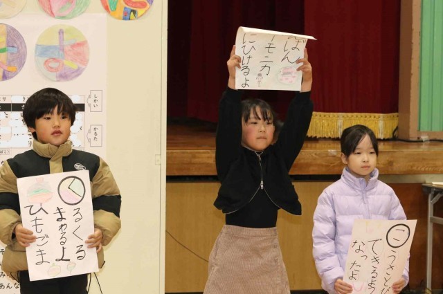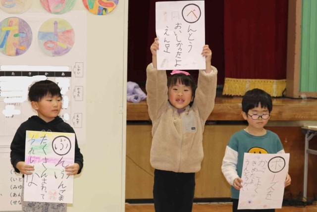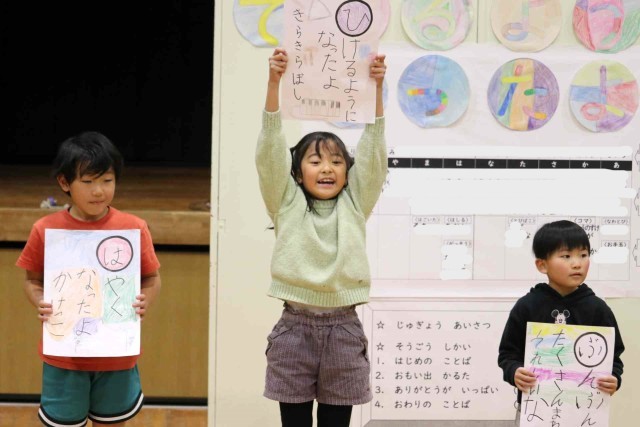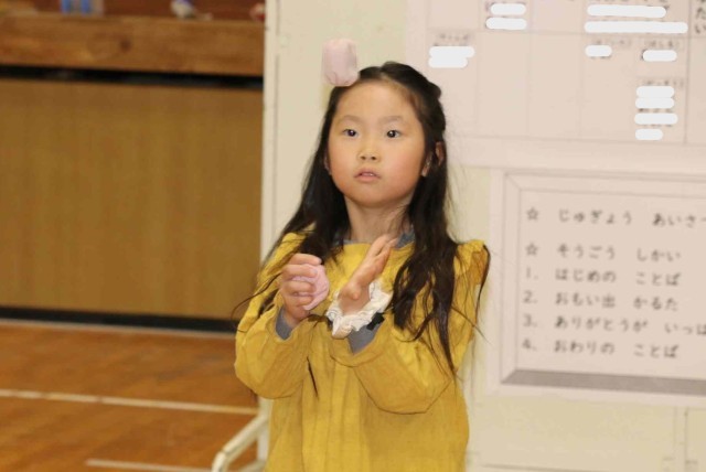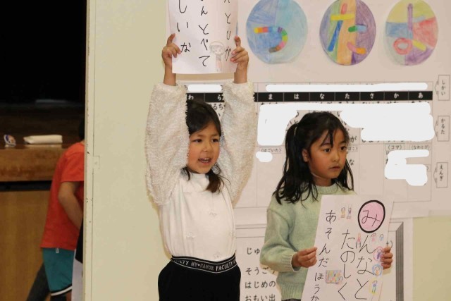 この1年の成長をカルタにして発表しました。縄跳び、跳び箱、ベーゴマ回し、竹とんぼなどいろいろなことができるようになりました。最後に合唱をして、お家の人に感謝する言葉を伝えることができました。