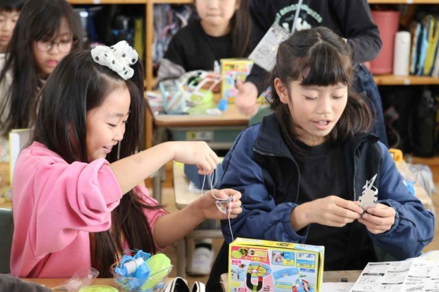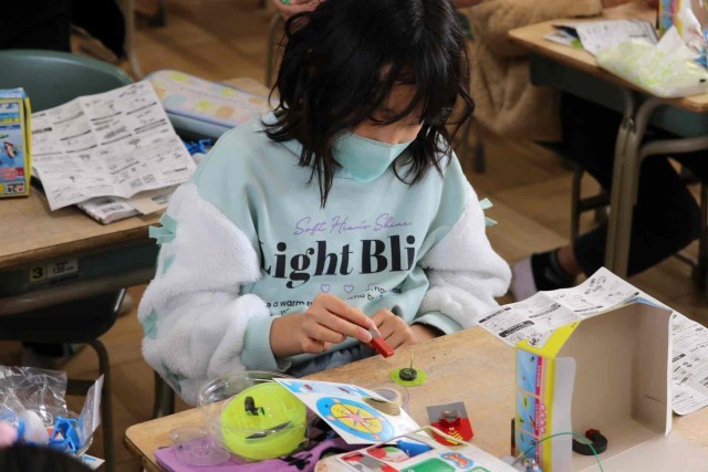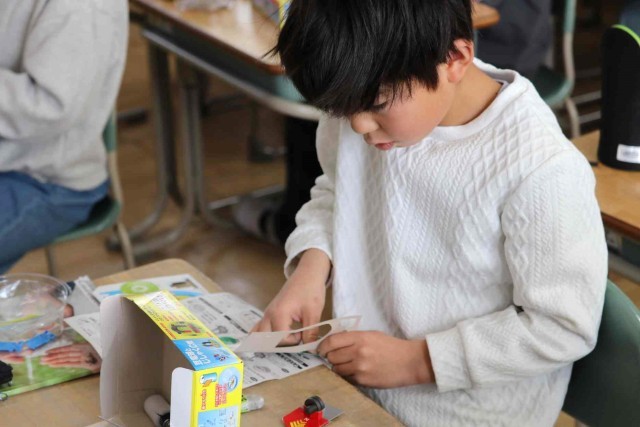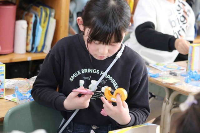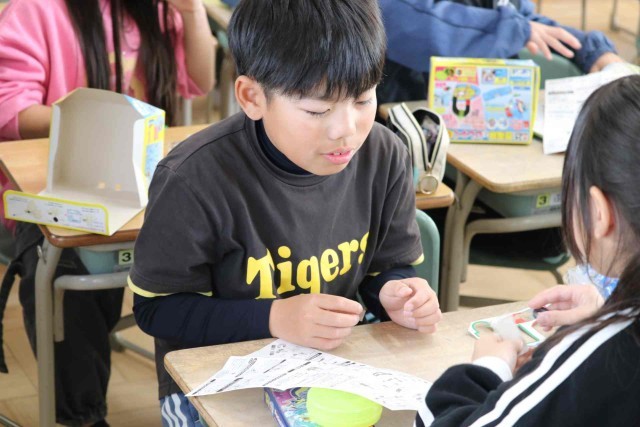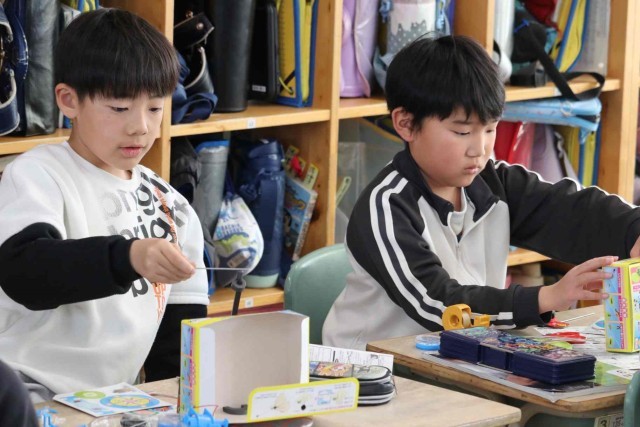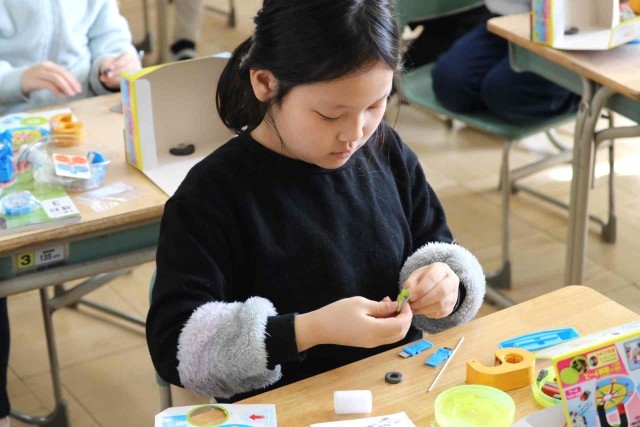 理科の授業で磁石の性質について学習しました。くっついたり反発したりする磁石の働きを利用して、簡単なおもちゃを作りました。雪合戦ゲームや、お散歩わんわんなどで遊んでいました。