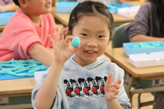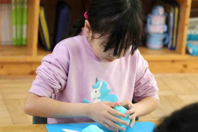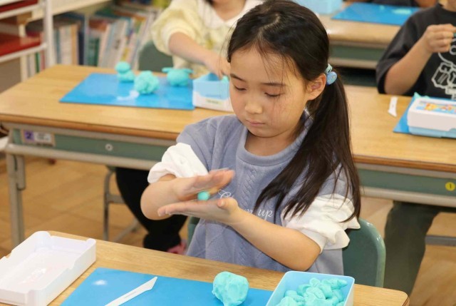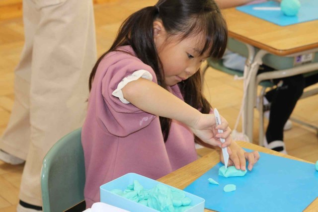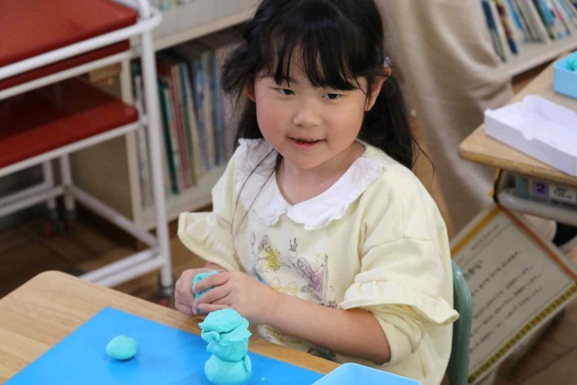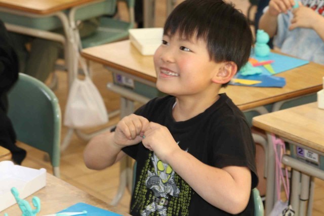 図工の授業で粘土を使った工作をしました。自分のお友達になる生き物をテーマにして、いろいろな形を作っていました。こねたりちぎったり丸めたりと、手先を器用に使って作品を仕上げていました。