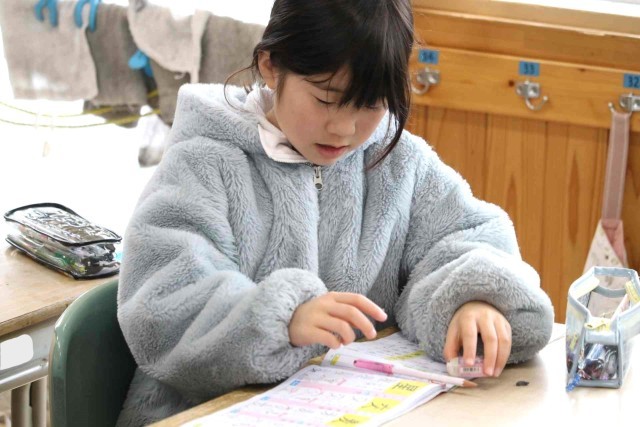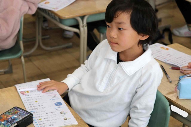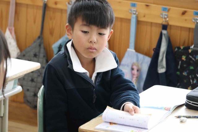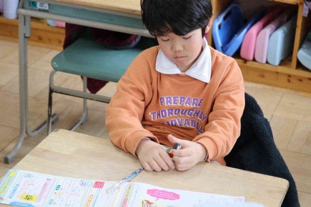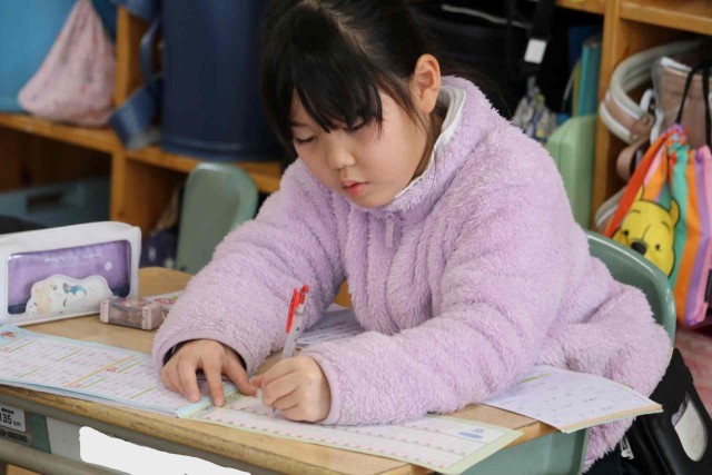 国語の授業で漢字の学習をしました。「町に行く」「点線でおる」「元気な声」「音を聞く」といった漢字が書けるようになりました。書き終わった子から担任の先生に提出していました。