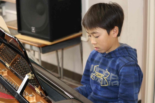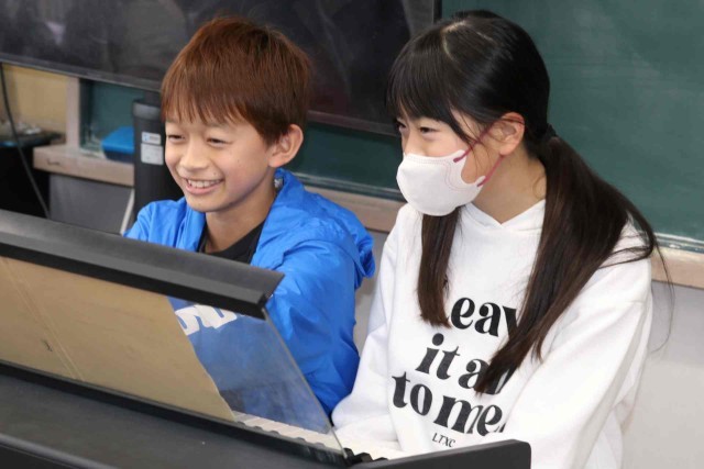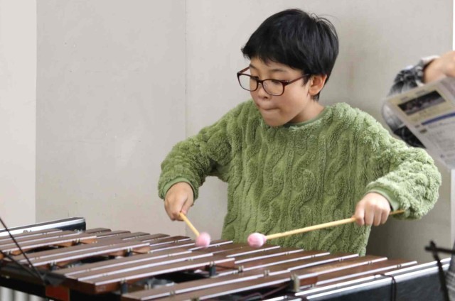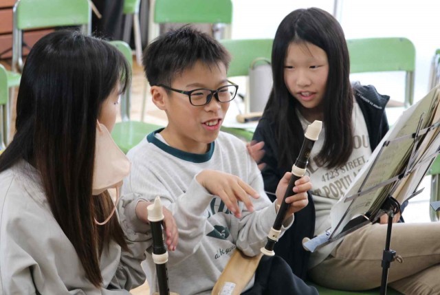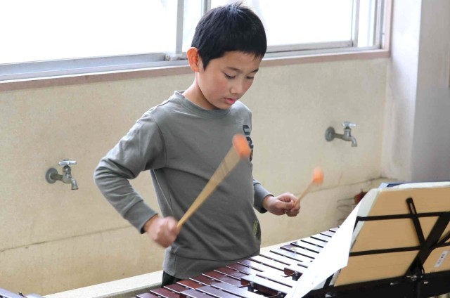 音楽の授業で楽器の演奏をしました。パートごとに分かれて「威風堂々」の練習をしました。音やリズムがずれていないか、同じパートの子に確認していました。