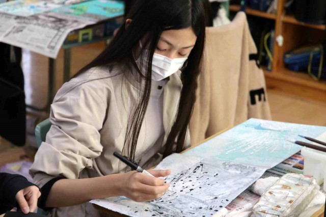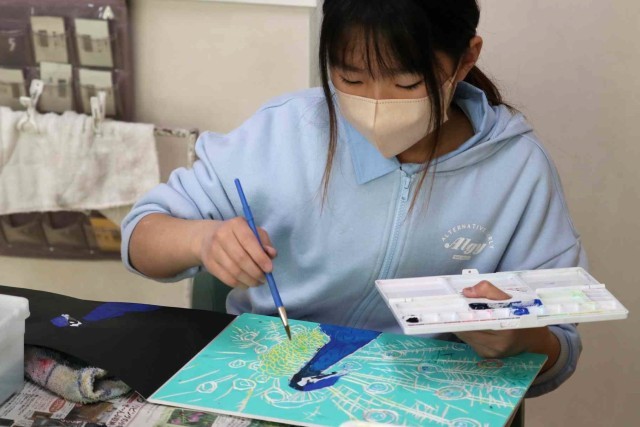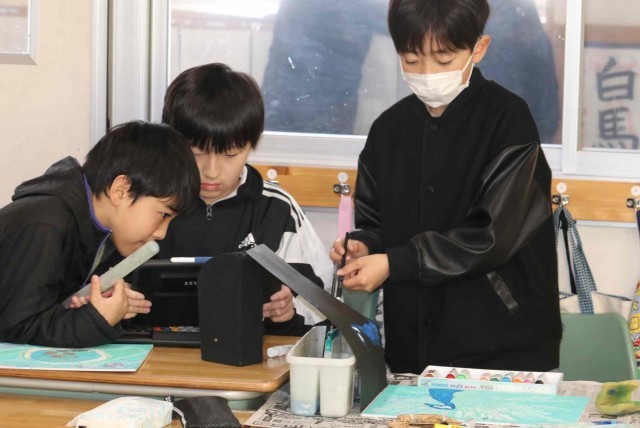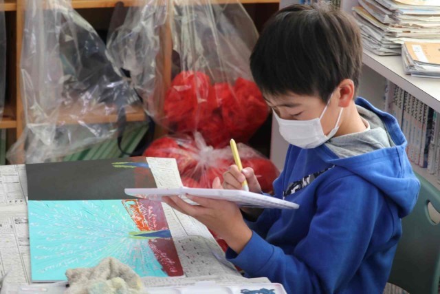 図工の授業で版画の学習をしました。みんなに愛されてきたクジャクのクックの姿が鮮やかに浮かび上がりました。天国にいるクックもきっと喜んでいると思います。