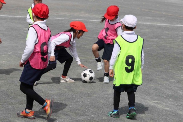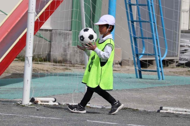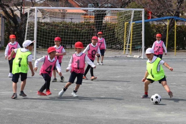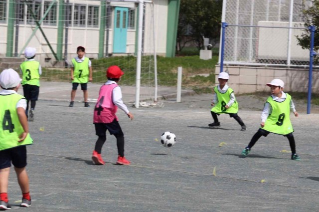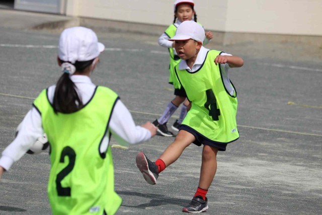体育の授業でサッカーの試合をしました。先週は風が強くてボールが勝手に転がっていましたが、今日は風も穏やかで楽しくプレーすることができました。シュートが決まるととてもうれしそうでした。