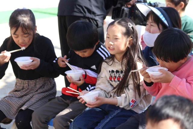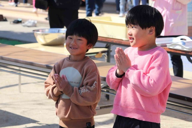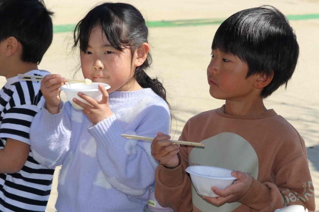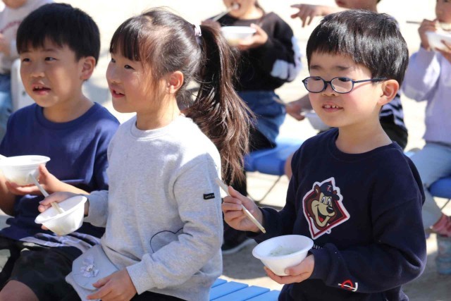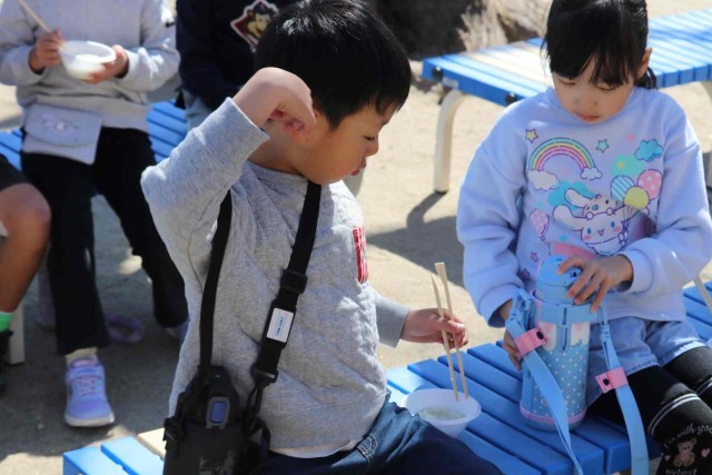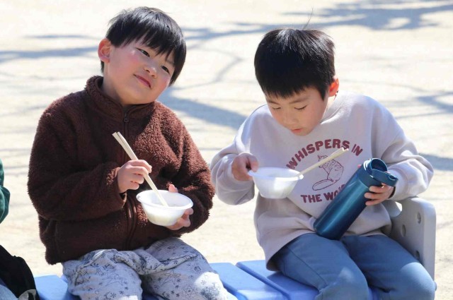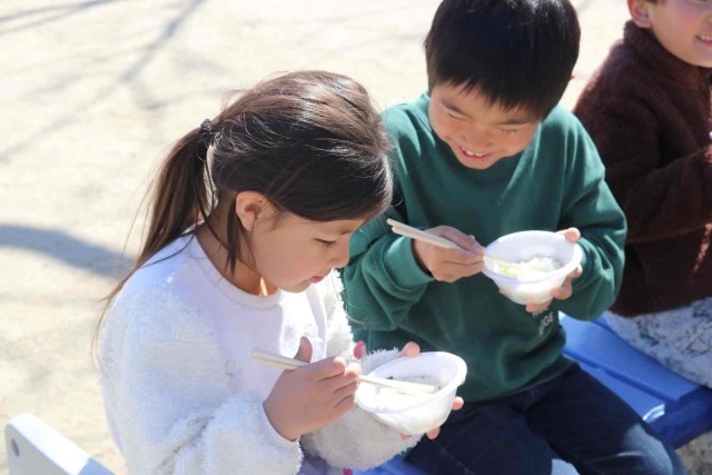 1年生が志貴保育園を訪問し、七草がゆをいただきました。1年生と保育園児が田んぼで愛情を注いで作ったお米なので、とても美味しく感じました。給食を食べた後でしたが、おかわりする子がたくさんいました。