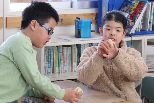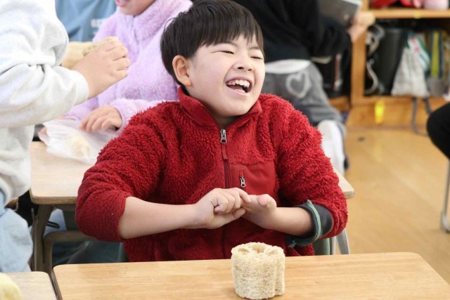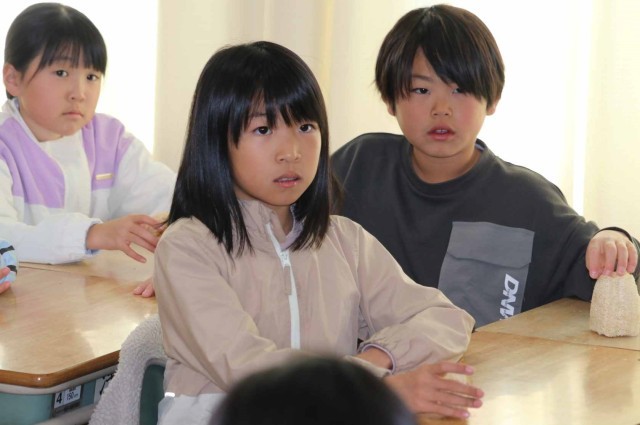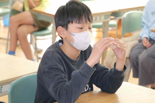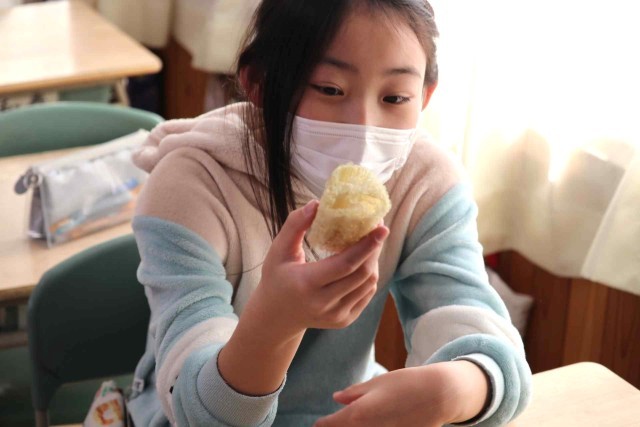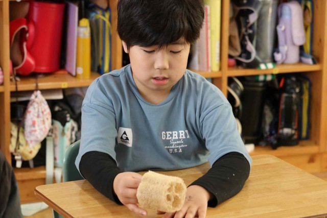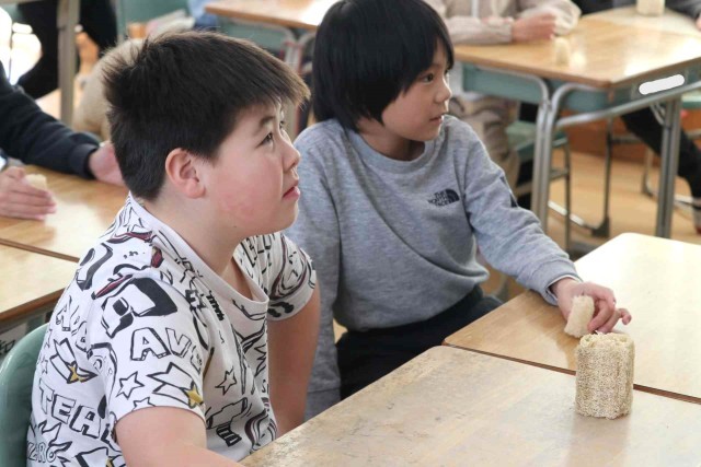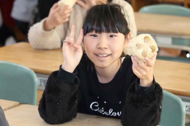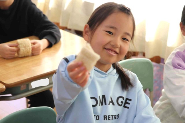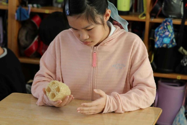 理科の授業で育てたヘチマを配りました。乾燥させたヘチマを手に取ると、興味深そうに眺めていました。たわしとして活用できるとよいですね。