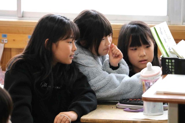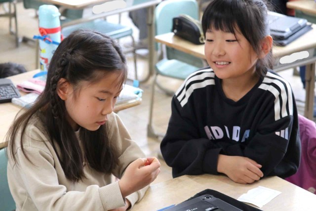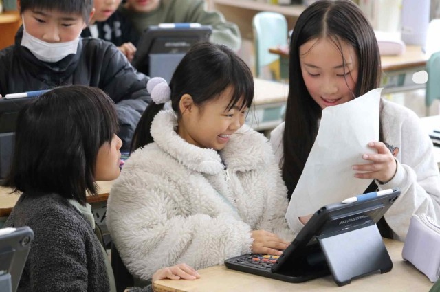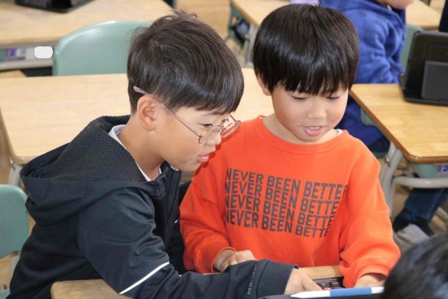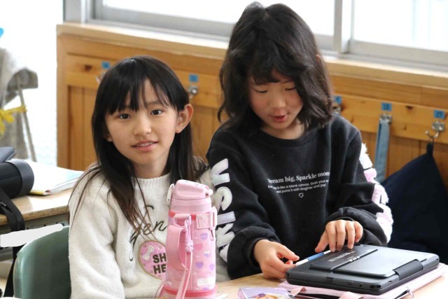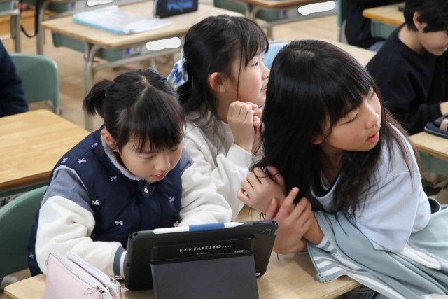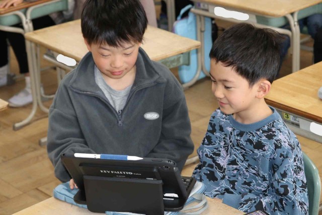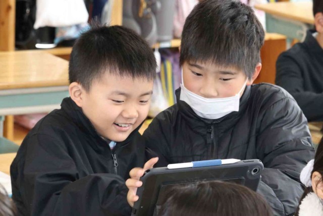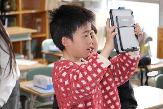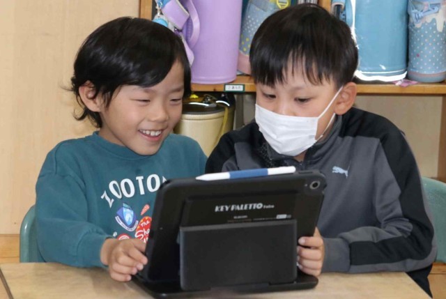 この1年間の出来事をクイズにしてふり返っていました。「遠足はどこに行ったでしょう?」などの問題を考えて、クラスメイトに出題しました。タブレットの操作にもかなり慣れてきました。