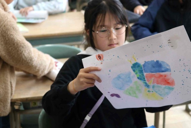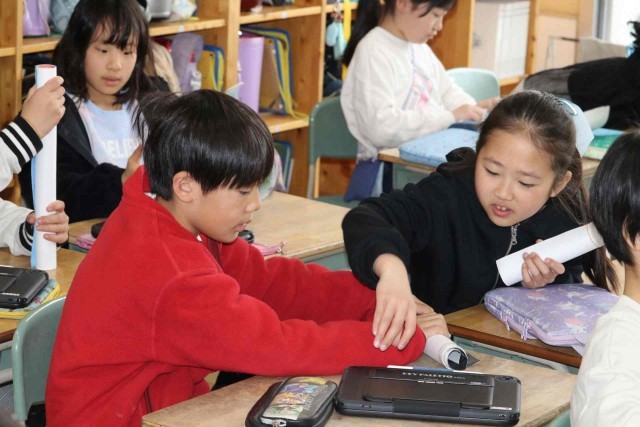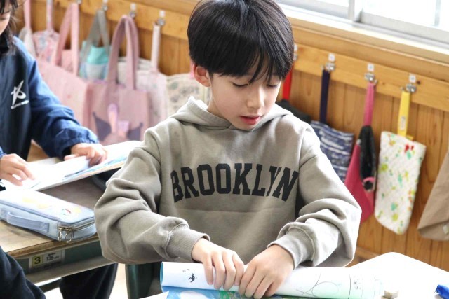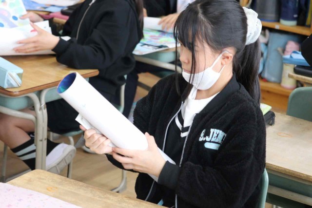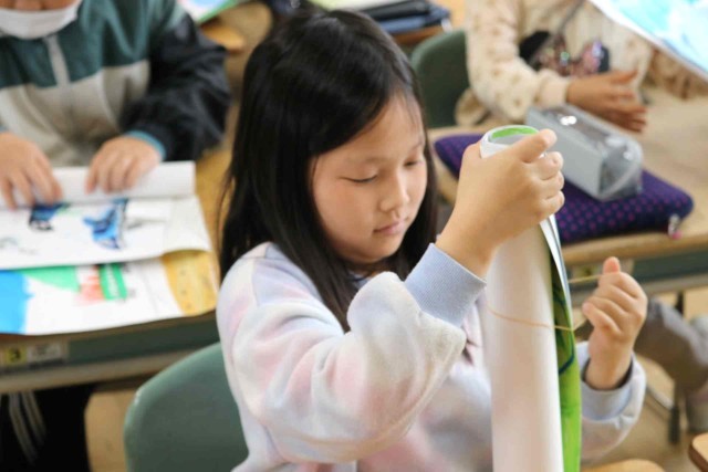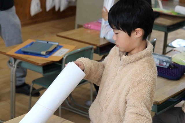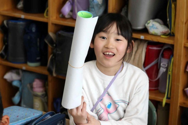 明日の修了式を前に、今年度作った作品を返却しました。画用紙をくるくる巻いて輪ゴムをつけるのに苦労していました。忘れてしまっていた作品を見て、なつかしそうに思い出している子もいました。