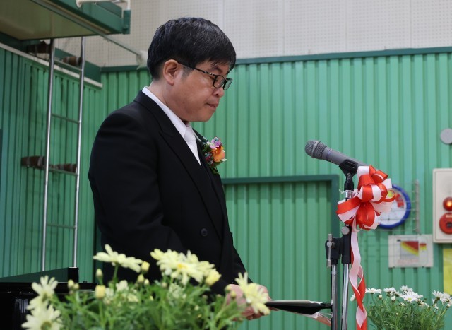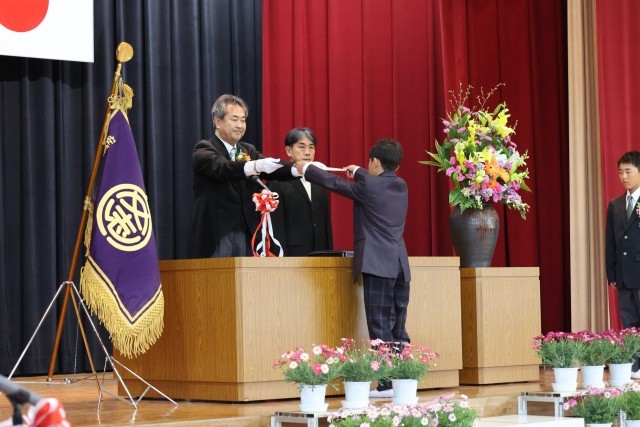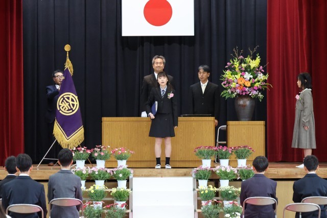 16名の卒業生が、証書を立派に受け取った後、一人一人舞台上で、誓いのことばを話しました。これからの具体的な目標が述べられ、一人一人の思いが体育館に響きました。校長先生の式辞では、その時々を一生懸命に生きることのすばらしさが語られ、子どもたちは背筋を伸ばして聞いていました。PTA会長様の祝辞からは、今後も目標に向かって進んでいけるようにたくさんの愛と励ましのことばをいただきました。