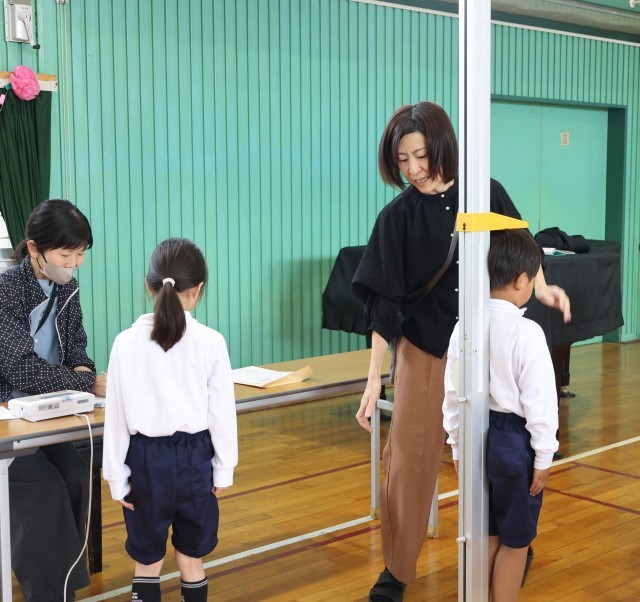 2・3時間目に全校一斉の身体測定を行いました。全校児童が15のグループに分かれて、5つの検査と顔写真撮影をしました。上の学年の子がリーダーとなって、各検査場所を回り、無事に終えることができました。