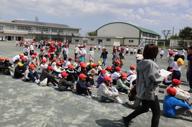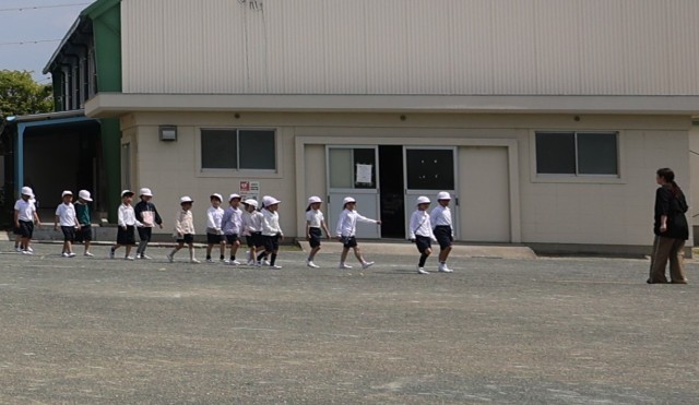 子どもたちは、「おはしも」を守って校舎内から避難し、校舎を出ると、足早に集合場所に向かいました。