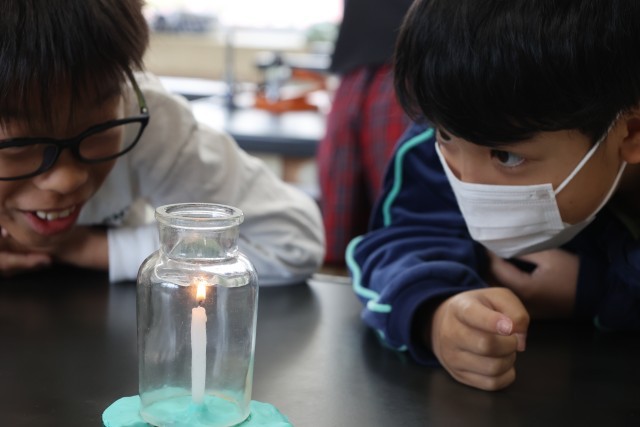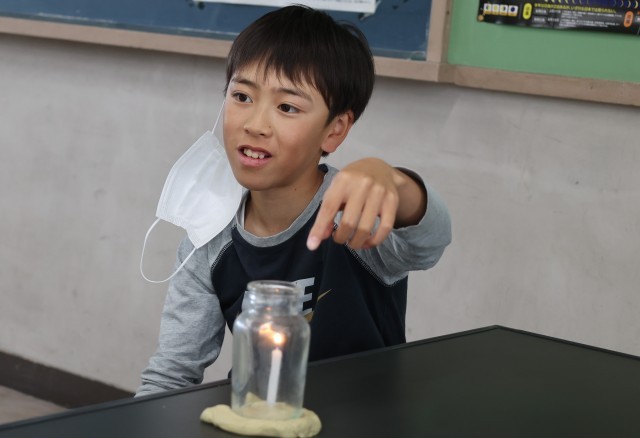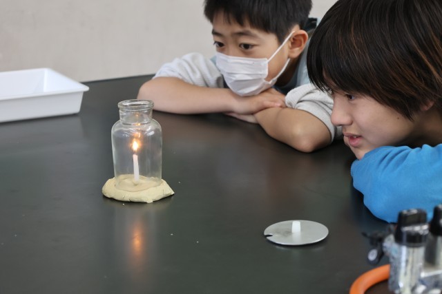 ろうそく、集気びん、粘土を使って、ろうそくが燃え続ける条件について調べました。
