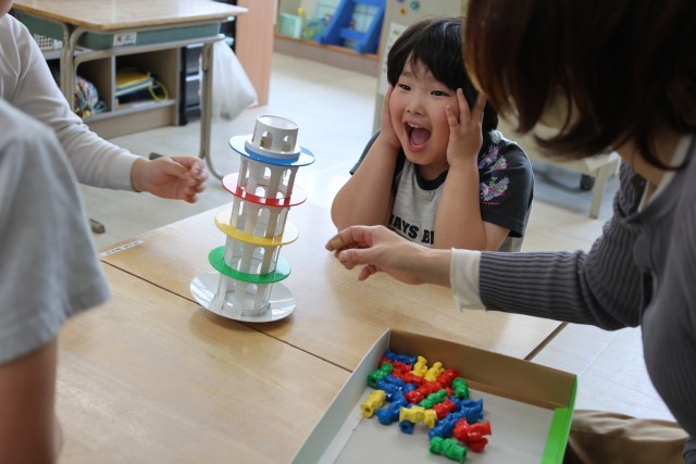 バランスを考えて、人形が倒れないように乗るのはどこか考えるゲールです。落ちないように、落ちないように、手先をしっかり使ってそっとそっと乗せました。