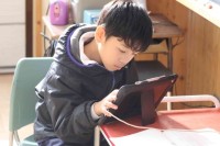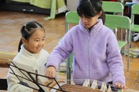 音楽の授業で箏の学習をしました。ペアを作り交代しながら基本的な指使いを覚えました...