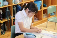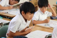 国語の授業で漢字の練習をしました。今日は「雲」「晴」「船」「店」などの字を覚えました。少しずつ画数の多い字が増えてきましたが、みんな最後まできれいに書こうとしていました。