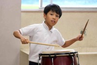 音楽の授業で打楽器による曲作りをしました。太鼓やシンバル、トライアングルなど、担当する楽器を決めて、友達と楽しそうに演奏していました。ピアノを囲んで合唱もしました。
