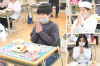 今日の献立は、ごはん、春巻き、生あげのオイスターソース炒め、海藻サラダです。みどり・わかば学級の会食の様子です。