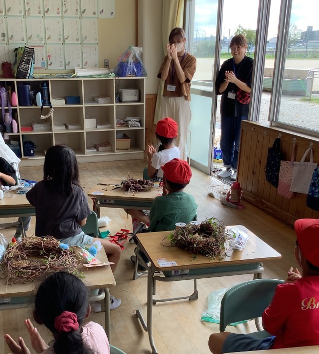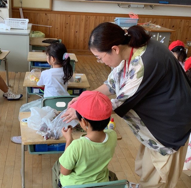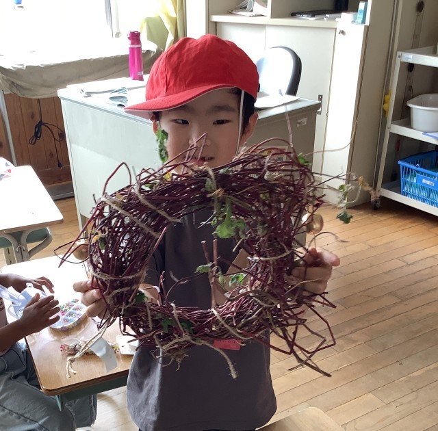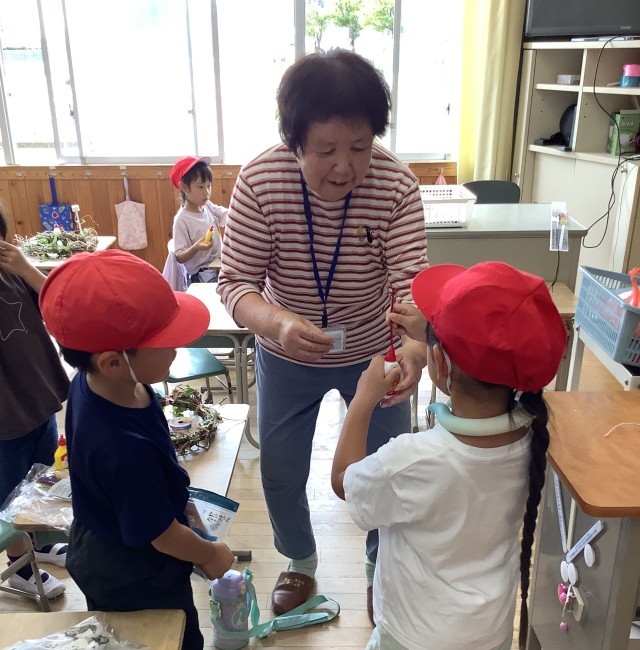 リース作りで一番大変なのは、アサガオのツルを支柱から外すことです。なかなか根気のいる作業です。子どもたちからのSOSに担任一人では手が回らないところを、ボランティアの方々が助けてくださいました。飾り付けのところでは、「ボンドが固まって出てこない」と言って、ボランティアさんに助けを求めている子がいました。