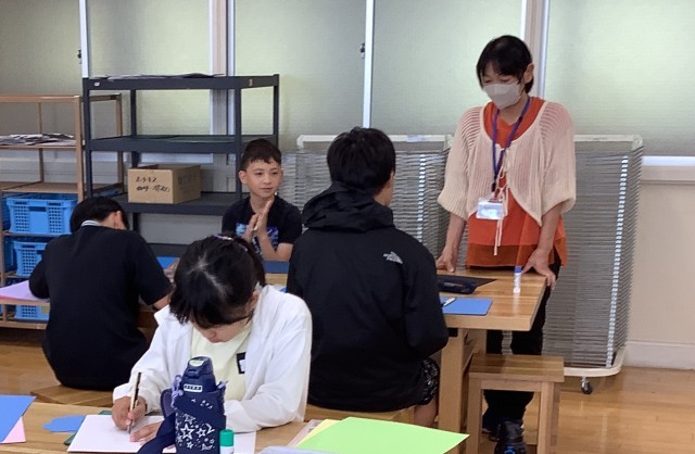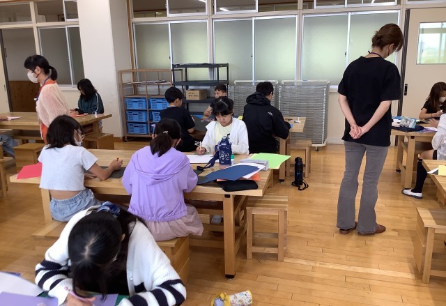 教員が安全指導をした後、カッターの刃を出しっぱなしにする子や、指をカッターの進む方向に出してしまう子がないよう、安全を見守ってくださいました。「紙を回すと切りやすいよ」というアドバイスもしてくださって、大変助かりました。