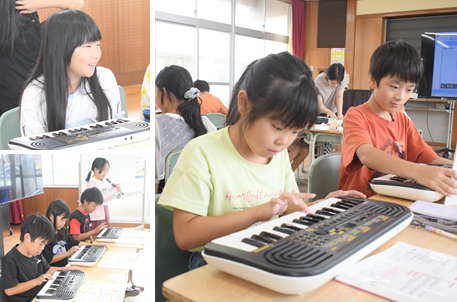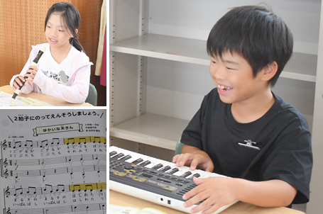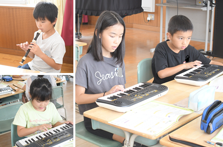 「ゆかいな木きん」をグループで演奏しています。リコーダーとキーボードのパートに分かれてグループで練習をしています。