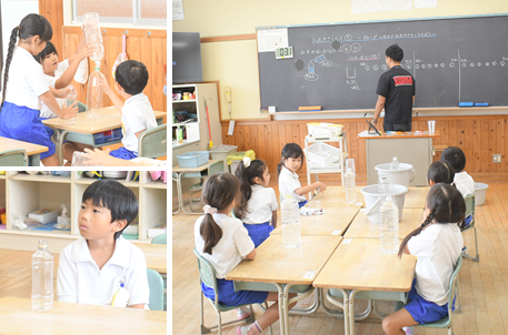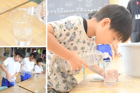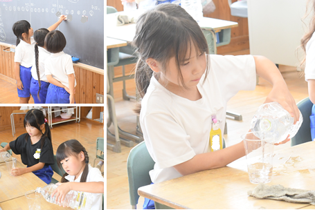 「おおきさくらべ」の学習です。今日は、ペットボトルに入る水の量(かさ)を比べます。どうすれば比べられるのか考えています。