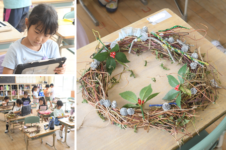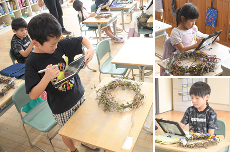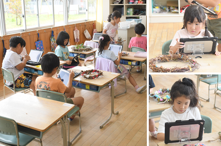 「あさがおリース鑑賞会」自分の作品で上手にできたところ、友だちの作品のよいところをたくさん見つけています。