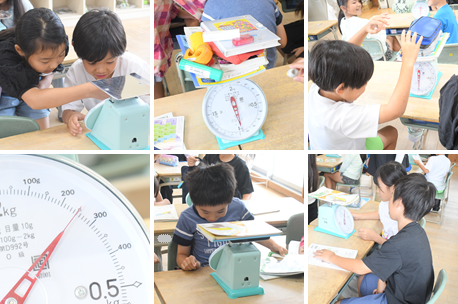 重さの学習です。はかりの目盛りの読み方と、kg(キログラム)の単位を習いました。ちょうど1kgになるように、身の回りにあるものをはかりに乗せています。